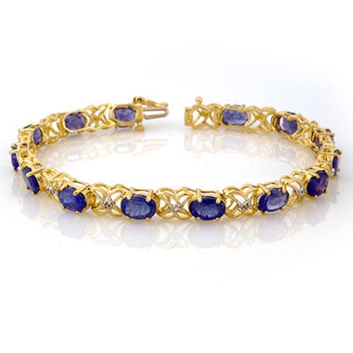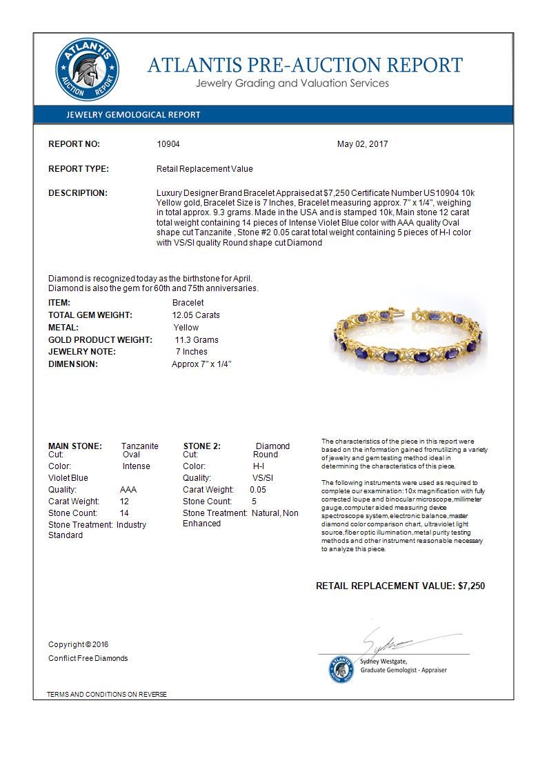12.05 CTW Tanzanite & Diamond Bracelet 10K Yellow Gold ---- Luxury Designer Brand Bracelet Appraised Retail Price at $7,250 ---- SKU Number US10904 10k Yellow gold Bracelet Size is 7 Inches, Bracelet measuring approx. 7" x 1/4", weighing in total approx. 9.3 grams. Made in the USA and is stamped 10k, Main stone 12 carat total weight containing 14 pieces of Intense Violet Blue color with AAA quality Oval shape cut Tanzanite , Stone #2 0.05 carat total weight containing 5 pieces of H-I color with VS/SI quality Round shape cut