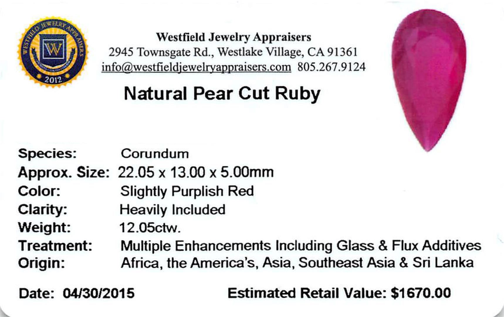 One pear mixed cut natural ruby, measuring 22.50 x 13.00 x 5.00mm, exact weight 12.05ct., clarity is heavily included, type II, medium dark, moderately strong, slightly purplish red color, (GIA slpR 6/4), cut is good. Transmitting light somewhat diffusely, transparent to translucent, Indications of laboratory high temperature heat treatment, with glass & flux additives. Low tolerance to rhodium plating, repolishing the surface & ultrasonic cleaning. Westfield Appraised at $1,670.00.