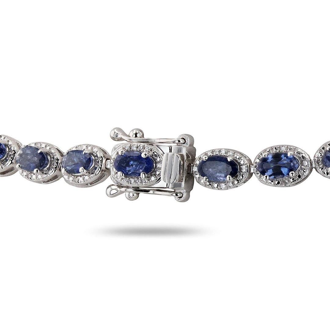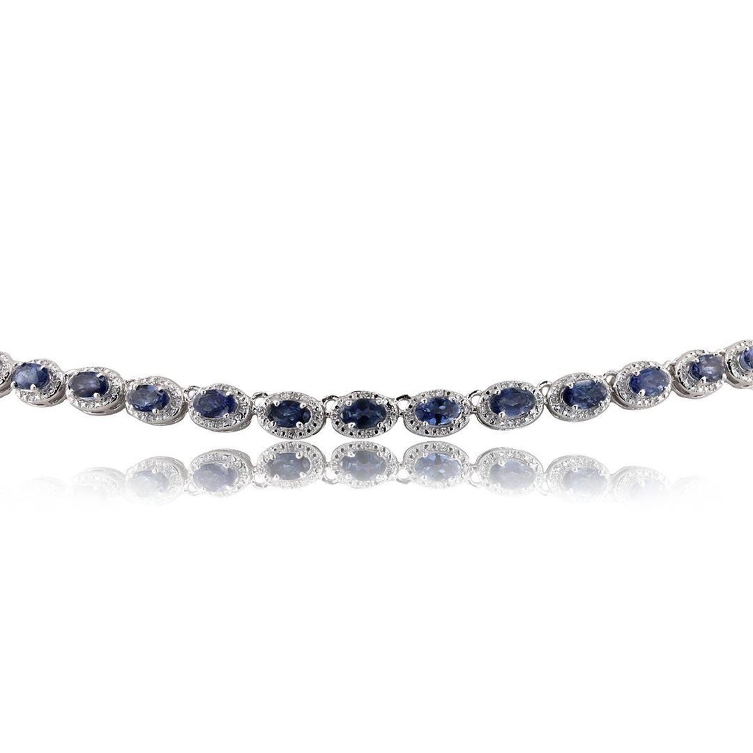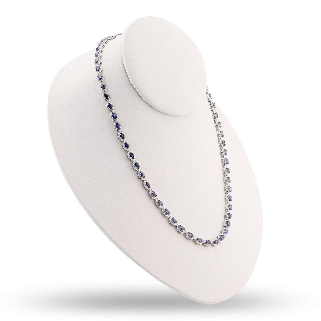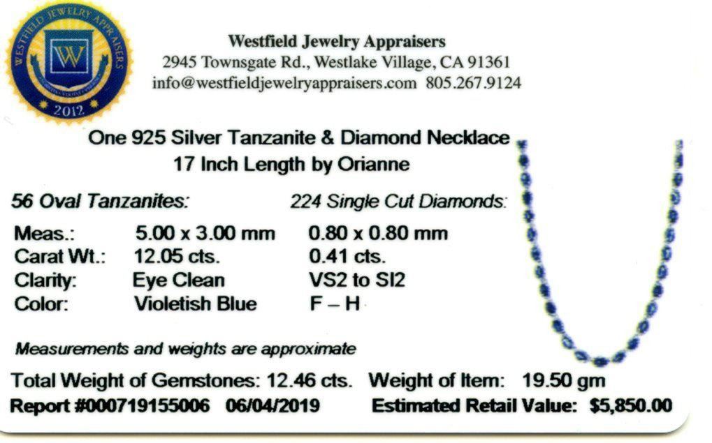 One electronically tested 925 silver ladies cast & assembled tanzanite & diamond necklace. 17 inch in length Trademark is Orianne. Identified with markings of "925". Condition is new, good workmanship. Containing: Fifty-six prong set oval cut natural tanzanites, measuring 5.00 x 3.00 x 1.95mm, approximate total weight of 12.05ctw., clarity is eye clean, type I, medium dark, moderately strong, violetish blue color, (GIA vB 6/4), cut is good. Transmitting light with no distortion, transparent. Graded in the setting. Two Hundred Twenty-Four bead set single cut diamonds, measuring 0.80 - 0.80 x 0.48mm (depth est.) approximate total weight of 224 Stones = 0.41ctw. Graded in the setting. Clarity VS-2 to SI-2 Color F - H Total Weight of Colored Stones 12.05 ctw. Total Weight of Diamonds 0.41 ctw. Total Weight of Necklace 19.50 gm