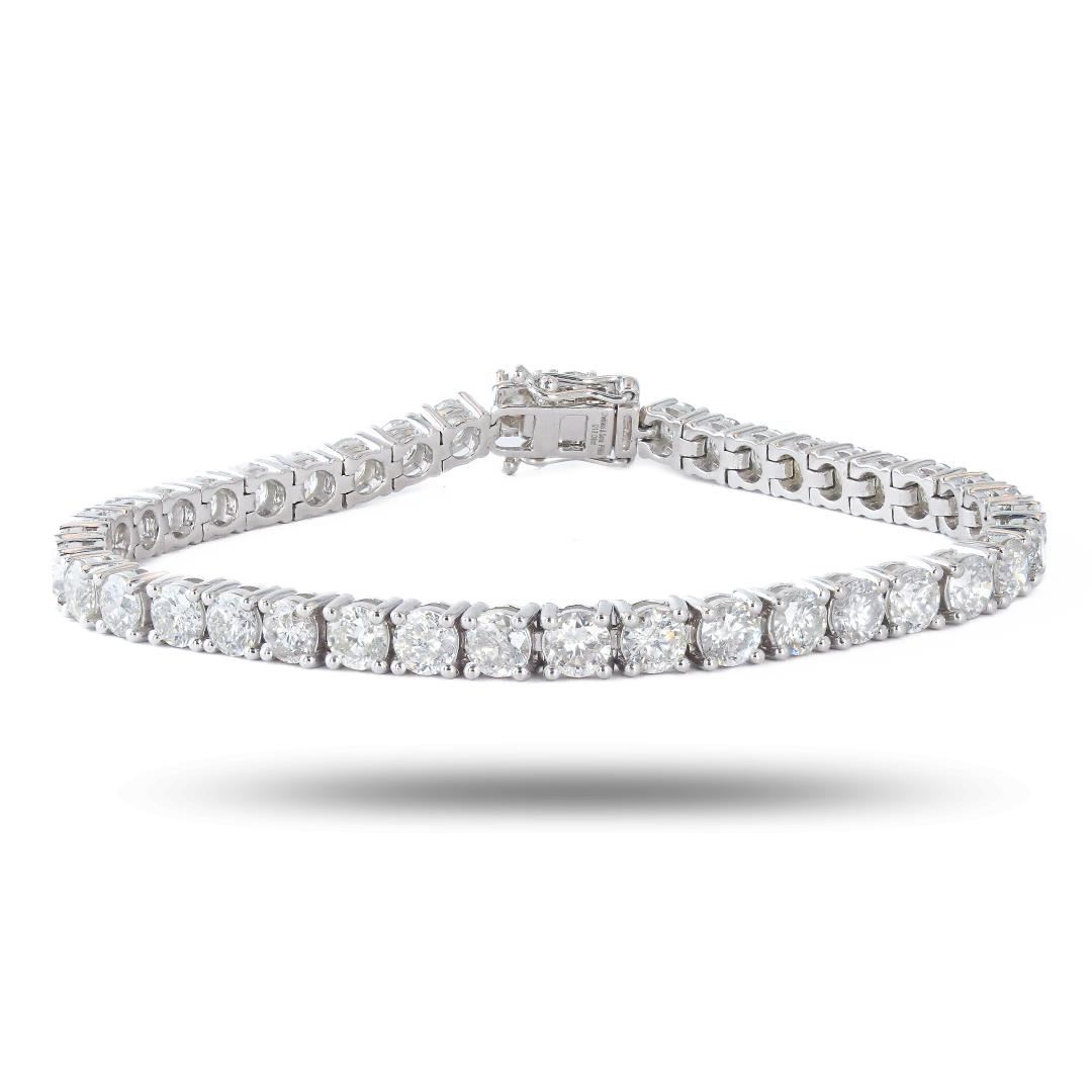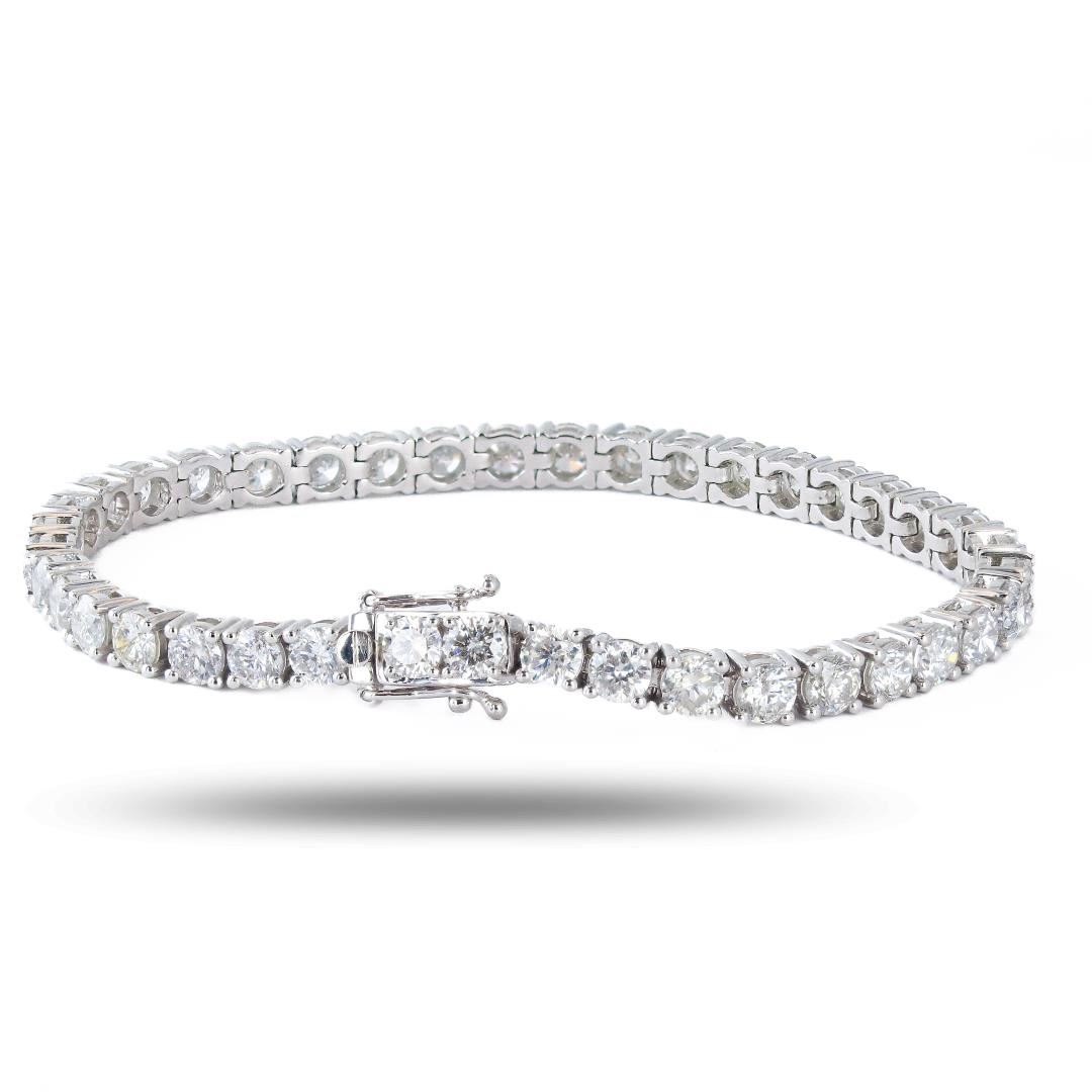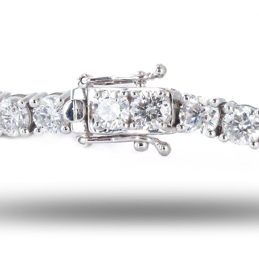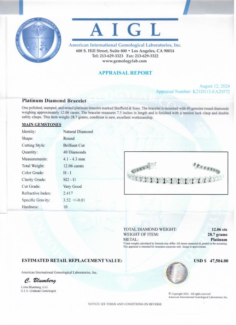One polished, stamped, and tested platinum bracelet marked Sheffield & Sons. The bracelet is mounted with 40 genuine round diamonds weighing approximately 12.06 carats. The bracelet measures 7.5 inches in length and is finished with a tension lock clasp and double safety clasps. This item weighs 28.7 grams, condition is new, excellent workmanship. #MAIN GEMSTONES# Identity: Natural Diamond Shape: Round Cutting Style: Brilliant Cut Quantity: 40 Diamonds Measurements: 4.1 - 4.3mm Total Weight: 12.06 carats Color Grade: H-I Clarity Grade: SI2-I1 Cut Grade: Very Good Refractive Index: 2.417 Specific Gravity: 3.52 +/-0.01 Hardness: 10 TOTAL DIAMOND WEIGHT: 12.06 cts WEIGHT OF ITEM: 28.7 grams METAL: Platinum Size: 7 1/2