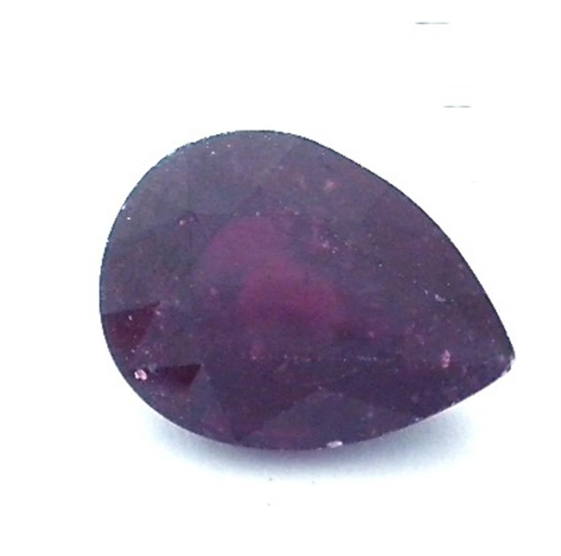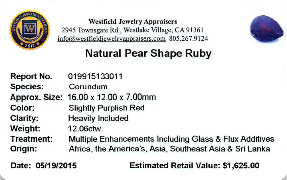 One pear mixed cut natural ruby, measuring 16.00 x 12.00 x 7.00mm, exact weight 12.06ct., clarity is heavily included, type II, dark, very slightly brownish, slightly purplish red color, (GIA slpR 7/3), cut is good. Transmitting light somewhat diffusely, transparent to translucent. Naturally occurring internal & external characteristics are present. Indications of laboratory high temperature heat treatment, with glass & flux additives. Ruby has a low tolerance to rhodium plating, repolishing the surface, & ultrasonic cleaning. Westfield Appraised at $1,625.00.