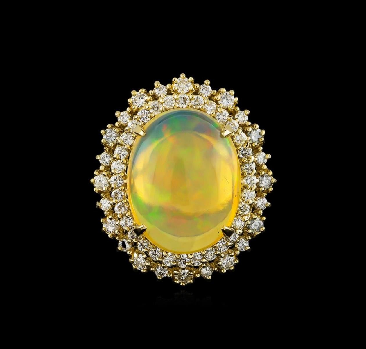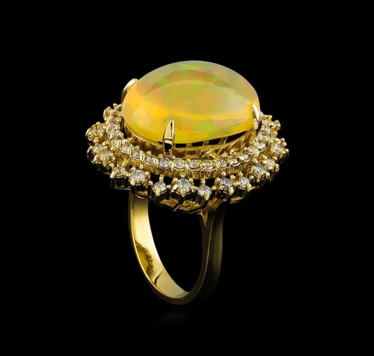 One electronically tested 14KT yellow gold ladies cast opal and diamond ring with a bright polish finish. The featured opal is set within tiered diamond bezels supported by tapering shoulders, completed by a three millimeter wide band. Identified with markings of "K14". Condition is new, good workmanship. Containing: One semi crystal opal that is cut in a oval shaped cabochon and is prong set, measuring 17.60 mm long x 13.55 mm wide, and 8.05 mm thick and the approximate weight is 12.07 carats. The opal has a somewhat bright, multicolor play of color (fire) in a flashfire pattern; a high dome; a good cut; no inclusions; minor dull spot in its brightness and pattern; and is slightly directional. Graded in the setting. Twelve prong set round brilliant cut diamonds, measuring 2.00 - 2.00 x 1.20mm (depth est.) approximate. Total Weight of 12 Stones = 0.45ct. Graded in the setting. Clarity: SI-2 to I-1. Color: F - H Forty-Four prong set round brilliant cut diamonds, measuring 1.60 - 1.50 x 0.93mm (depth est.) approximate. Total Weight of 44 Stones = 0.69ct. Graded in the setting. Clarity: SI-2 to I-1. Color: F - H. Total Weight of Diamonds 1.14ct. Total Weight of Opals 12.07ct. Total Weight of Ring 10.45gm. AIG Appraised.