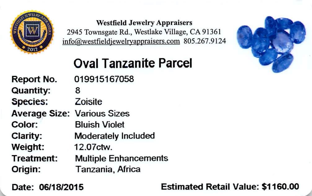Eight oval mixed cut natural tanzanites exact total weight 12.07ct., clarity is moderately included, type I, medium dark, very slightly grayish, bluish violet color, (GIA bV 6/3), cut is good. Transmitting light with a minimum of distortion, transparen Westfield Appraised at $1,160.00.