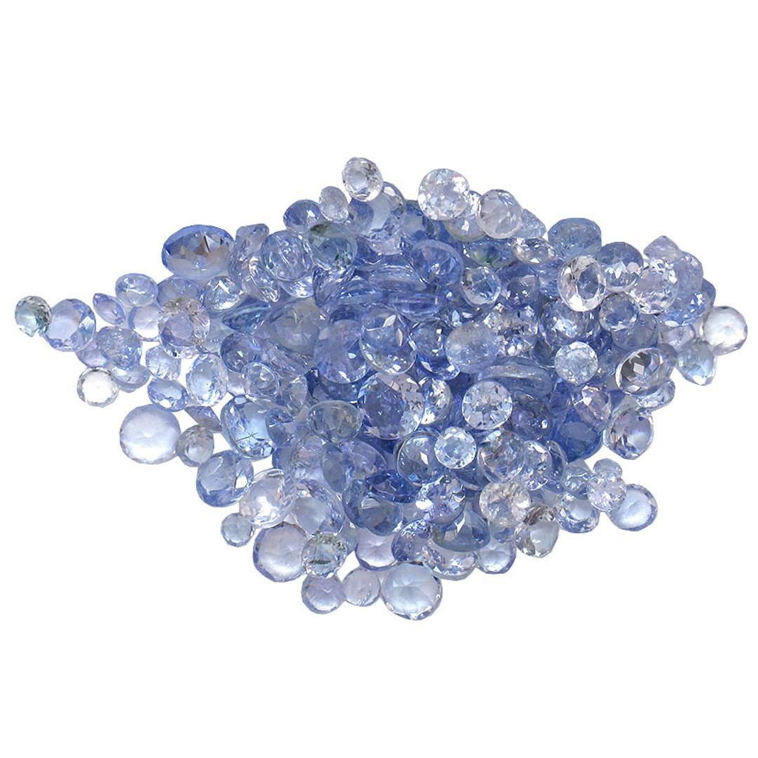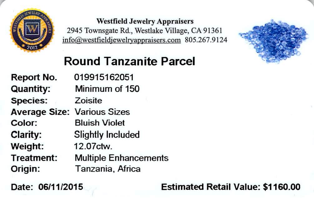 One hundred fifty round mixed cut natural tanzanites exact total weight 12.07ct., clarity is eye clean, type I, medium dark, very slightly grayish, bluish violet color, (GIA bV 6/3), cut is good. Transmitting light with no distortion, transparent. Col Westfield Appraised at $1,160.00.