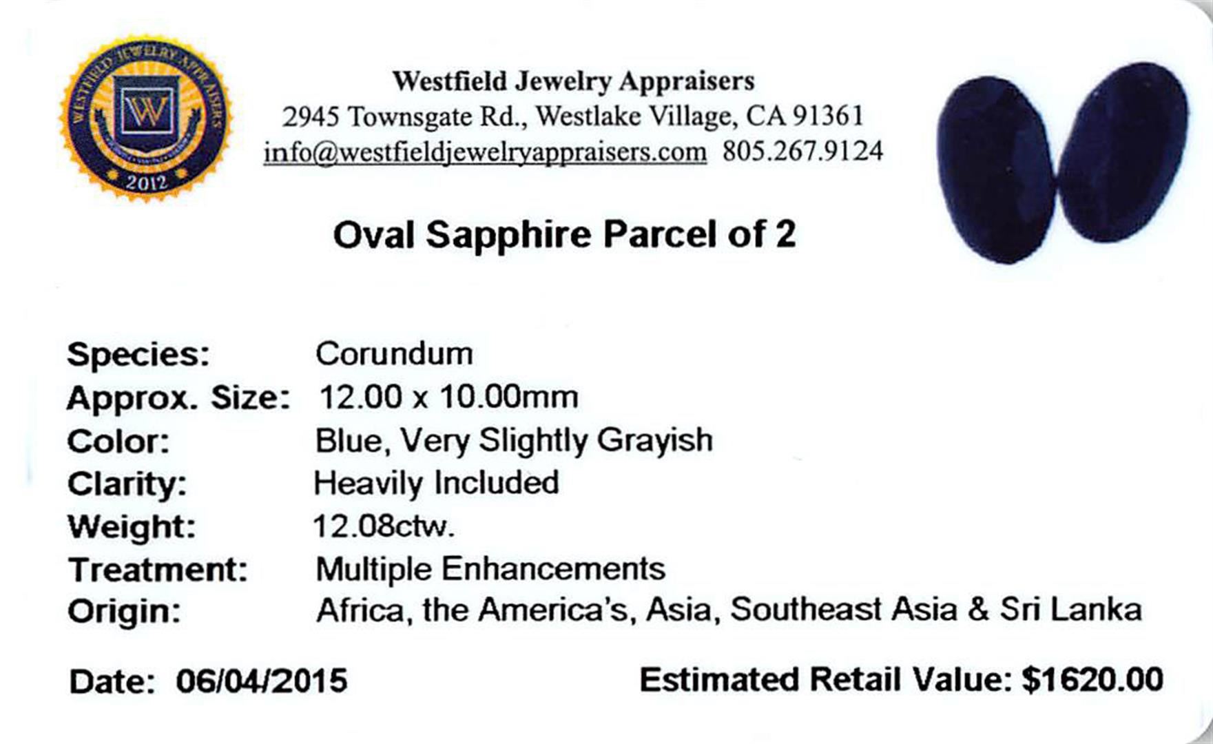 Two oval mixed cut natural blue sapphires, measuring 12.00 x 10.00 x 6.00mm, exact total weight 12.08ct., clarity is heavily included, type II, very dark, very slightly grayish, blue color, (GIA B 8/3), cut is good. Measurements are an average for the pair. Transmitting light very diffusely, opaque. Naturally occurring internal & external characteristics are present. Indications of multiple laboratory enhancements, including high temperature heat treatment. Westfield Appraised at $1,620.00.