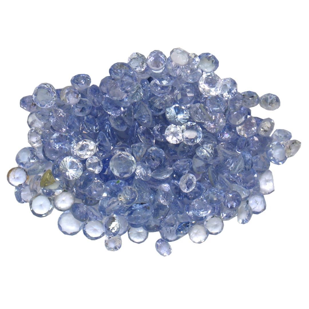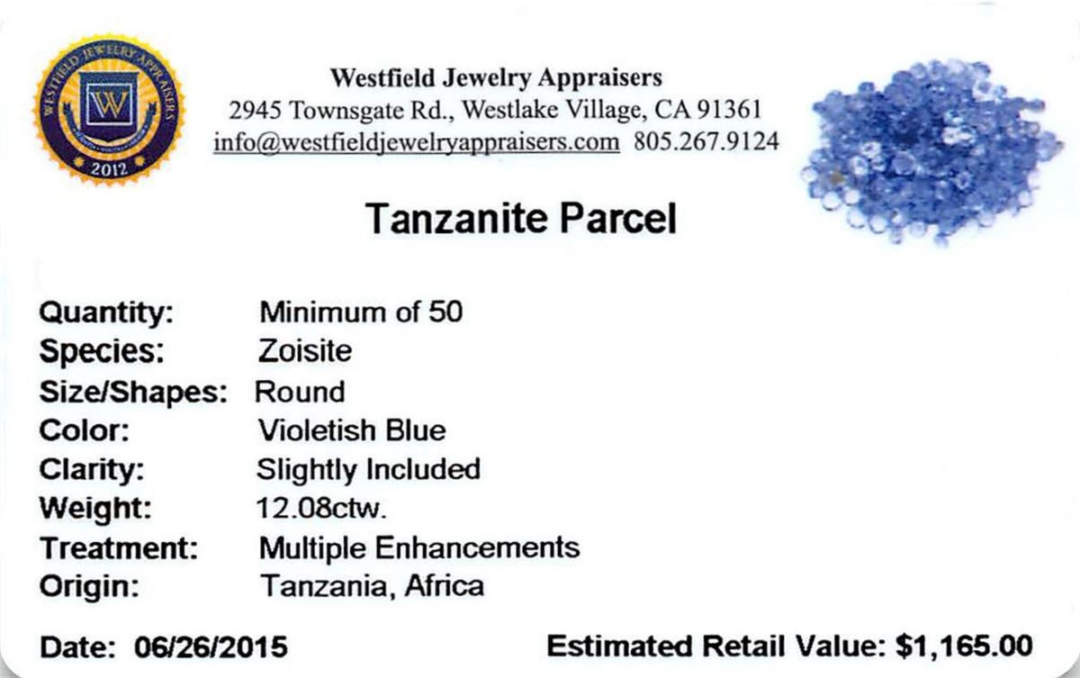 Fifty round mixed cut natural tanzanites, measuring 2.00 - 2.00 x 1.30 mm, exact total weight 12.08ct., clarity is slightly included, type I, medium, very slightly grayish, violetish blue color, (GIA vB 5/3), cut is good. Measurements & the color grade are an average for the group, Color grade is an average for the group, Transmitting light with no distortion, transparent, Naturally occurring internal & external characteristics are present, Indications of multiple laboratory enhancements, including high temperature heat treatment. Westfield Appraised at $1,165.00.