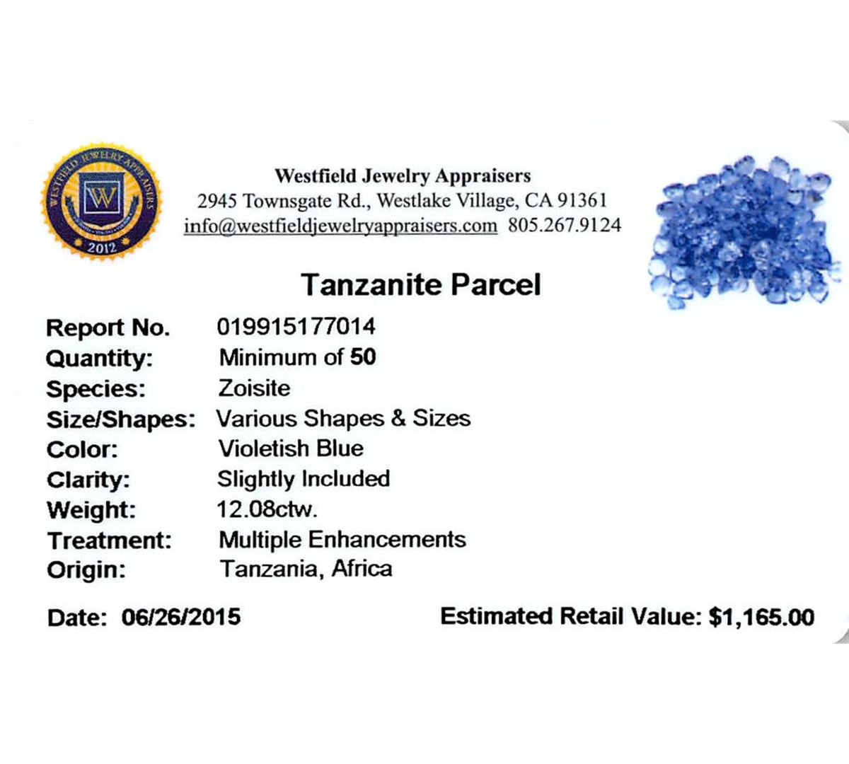 Fifty round mixed cut natural tanzanites, measuring 3.00 - 3.00 x 1.95 mm, exact total weight 12.08ct., clarity is slightly included, type I, medium, very slightly grayish, violetish blue color, (GIA vB 5/3), cut is good. Measurements & the color grade are an average for the group, Color grade is an average for the group, Transmitting light with no distortion, transparent, Naturally occurring internal & external characteristics are present, Indications of multiple laboratory enhancements, including high temperature heat treatment. Westfield Appraised at $1,165.00.