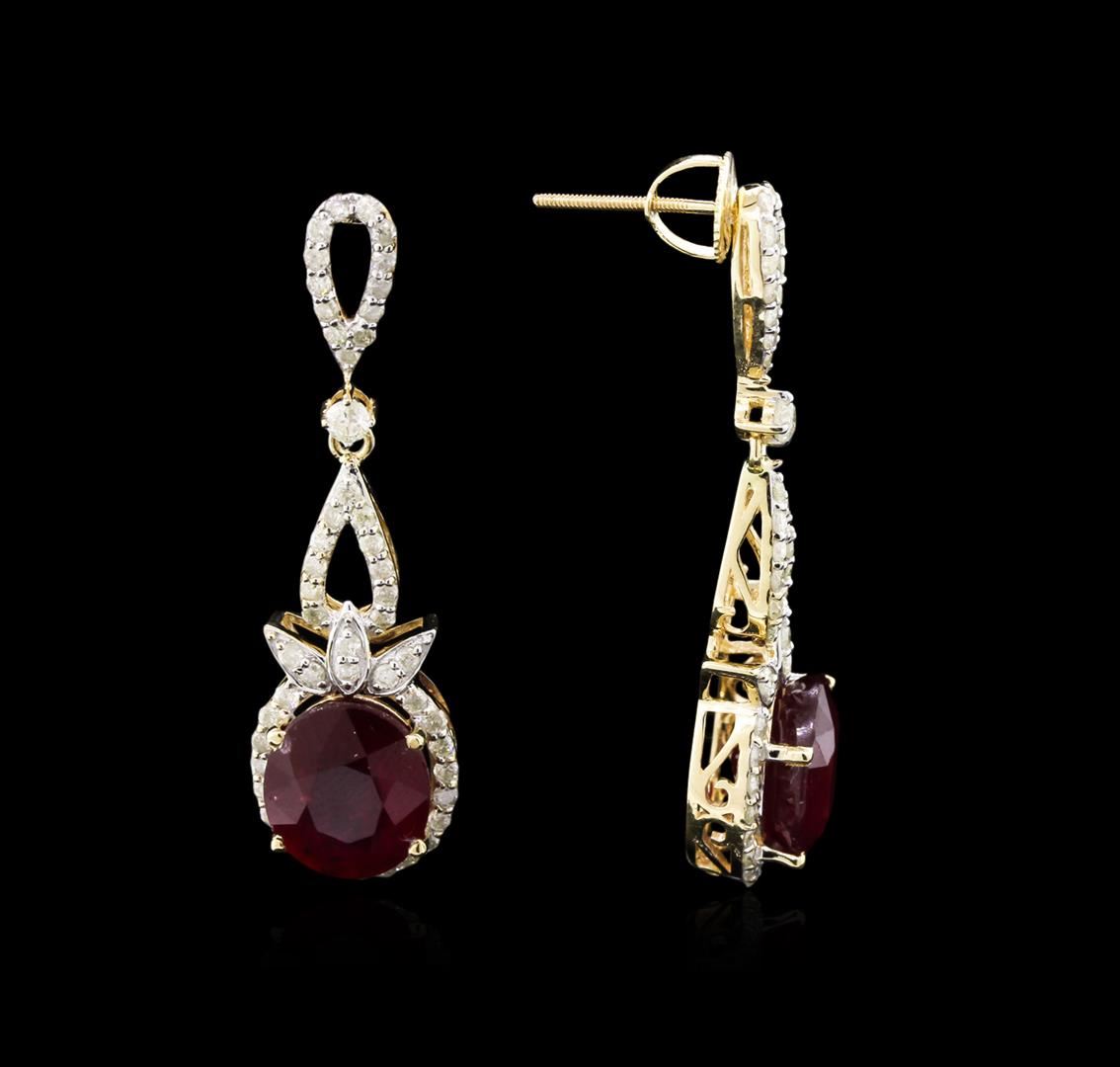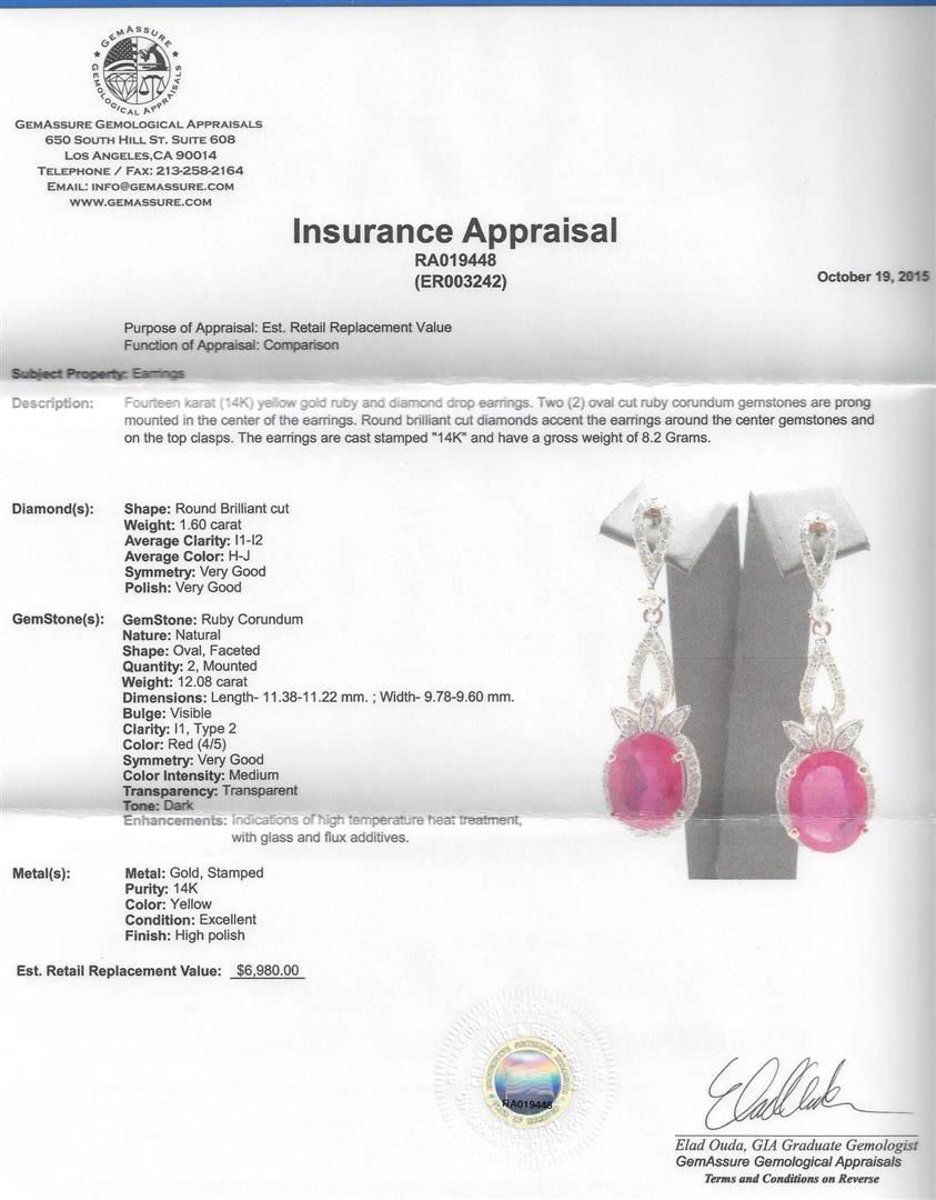 Fourteen karat (14K) yellow gold ruby and diamond drop earrings. Two (2) oval cut ruby corundum gemstones are prong mounted in the center of the earrings. Round brilliant cut diamonds accent the earrings around the center gemstones and on the top clasps. GGA Appraised.