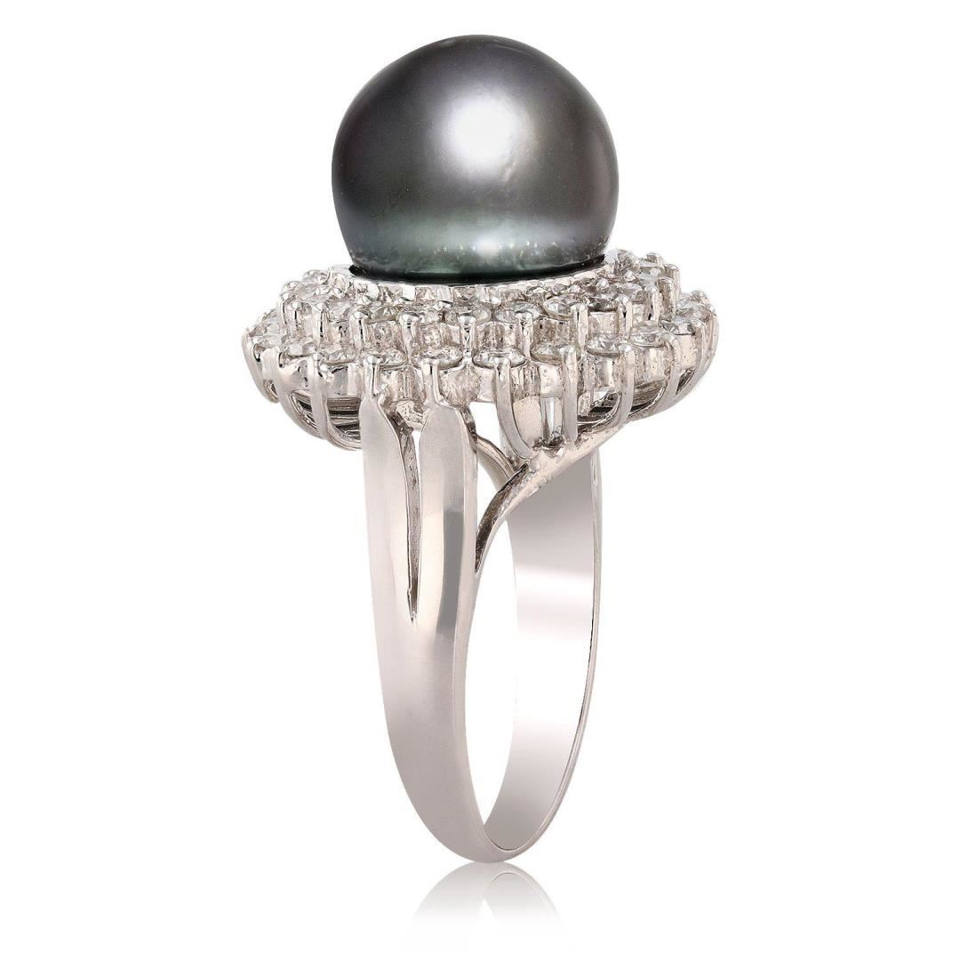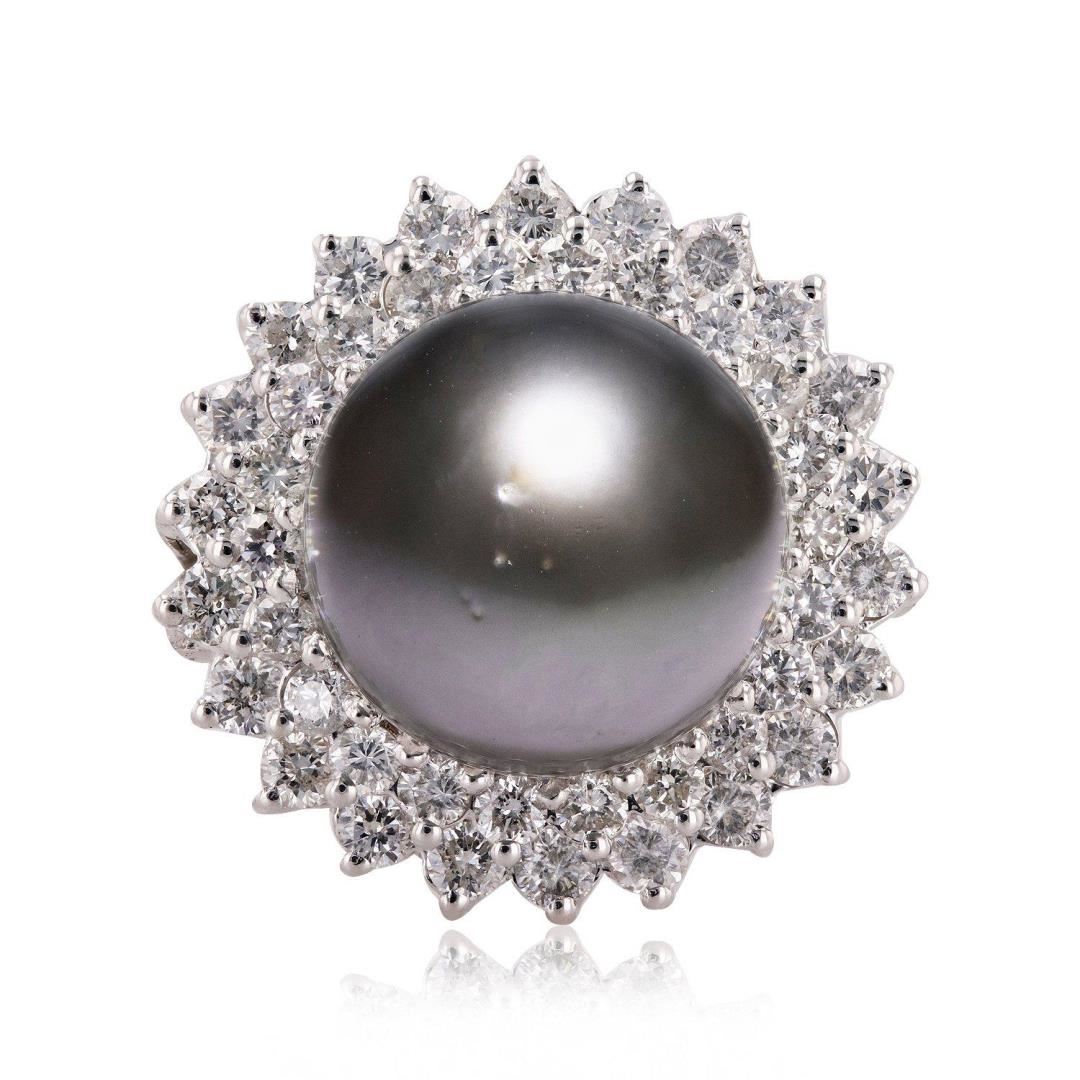 One electronically tested 14KT white gold ladies cast tahitian cultured pearl and diamond ring with a bright polish finish. Condition is new, good workmanship. The featured tahitian cultured pearl is set within a tiered diamond floret bezel, completed by a two and one-half millimeter wide band. Identified with markings of "K14". Containing:  One tahitian cultured pearl, 12.0mm in size. The pearl is dark silver in color with a very good luster, round, mostly clean Graded in the setting.  Tahitian cultured pearls form in the large "Black Lipped" Pinctada Margaritifera oyster, which is about twice the size of the Japanese Akoya oyster. This warm water species from across the central and South Pacific Ocean is at home in the bays and lagoons of the islands and atolls of French Polynesia. Tahitian cultured pearl farmers generally raise their oysters in lagoons. Tahitian cultured pearls take from two to four years to form. Black pearls are known for their iridescent, vibrant, almost metallic natural colors, unique among saltwater cultured pearls. Though commonly called "Tahitian" pearls, they are actually gray, to a lighter or darker degree. Tahitian pearls have the unique ability to display a variety of colors at the same time, which can be seen glistening on their surface.  Forty-four prong set round brilliant cut diamonds approximate total weight of 44 Stones = 1.37ct. Graded in the setting. Clarity SI-1 to I-1 Color G-I  Total Weight of Diamonds 1.37ct. Total Weight of Ring 9.66 gm #Size: 7