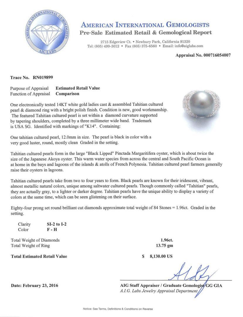 One electronically tested 14KT white gold ladies cast & assembled Tahitian cultured pearl & diamond ring with a bright polish finish. The featured Tahitian cultured pearl is set within a diamond curvature supported by tapering shoulders, completed by a th