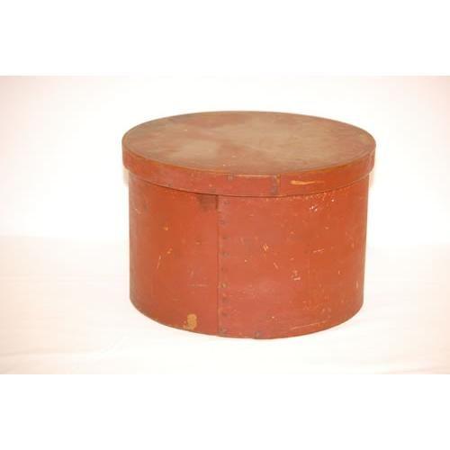 12 1/2" 19TH CENT. PAINTED ROUND PANTRY BOX-SINGLE BANDED IN OLD RED PAINT (8 1/4" T X 12 3/8" W) - WEAR TO PAINT, IMPERFECTIONS