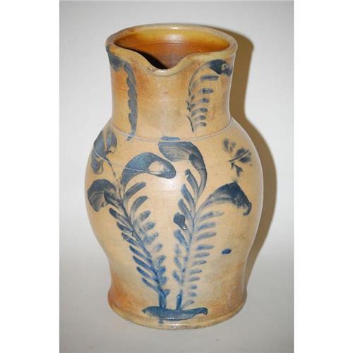 12 1/2" BOLDLY DECORATED STONEWARE PITCHER - 19TH CENT. WIDE OVOID BODY W/ CYLINDRICAL NECK & PINCHED BODY W/ LG. LILY DECORATION & BLUE HIGHLIGHTS (PA OR MID ATLANTIC STATES) - 3" TOP RIM HAIRLINE, SEV. SM. BASE RIM CHIPS, WEAR & IMPERFECTIONS