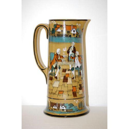 12 1/2" DELDARE BUFFALO POTTERY PITCHER-YE GOLDEN TIMES PATTERN W/ COLONIAL HOMES BORDER & 2 SCENES: "THE GREAT CONTROVERSY" & "ALL YOU HAVE TO DO TEACH THE DUTCHMAN ENGLISH" (12 1/2" T X 7 1/2" W) - WEAR, GLAZE CRAZING