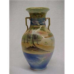 Nippon handled vase in urn shape, gilt enameled banding over scenic hand painted decoration, Nippon blue maple leaf mark, 12 1/2" h.