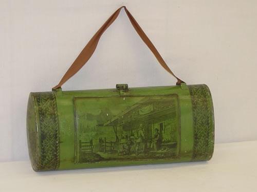 12 1/4" 19TH CENT. PAINTED TIN CANDLE BOX W/ HINGED LID W/ CLASP-DECORATED W/ FRENCH COTTAGE LANDSCAPE, BLACK ON GREEN BACKGROUND - DENTS, PAINT LOSSES & WEAR