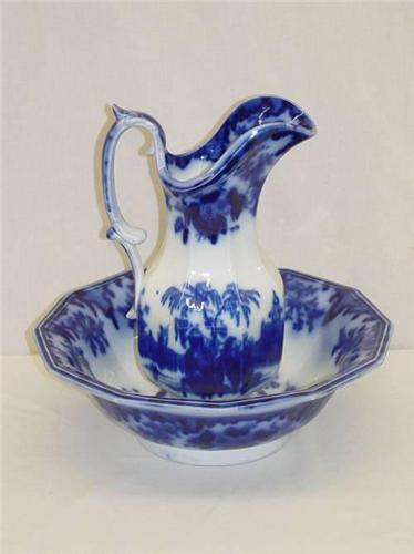 12 1/4" FLOW BLUE PITCHER and BOWL SET - SCINDE PATTERN BY ALCOCK - PROFESSIONAL REPAIR TO BOWL;