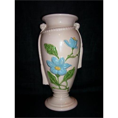 This is a stunning piece of HULL ART. It has different designs on each side. It is like having two vases for the price of one. On one side you have a single blue magnolia just starting to open with leaves and vines.The tassels only come down the sides. On the other side there are two blue magnolia flowers. One in full bloom and the other just starting to open. It also has leaves and vines. The tassel drapes across the top and down both sides. There are no cracks or chips. It has a high gloss glaze and the vase is in a pink. It is a beautiful addition to any collection. Don't forget Christmas is just around the corner. Don't let this one pass you by.