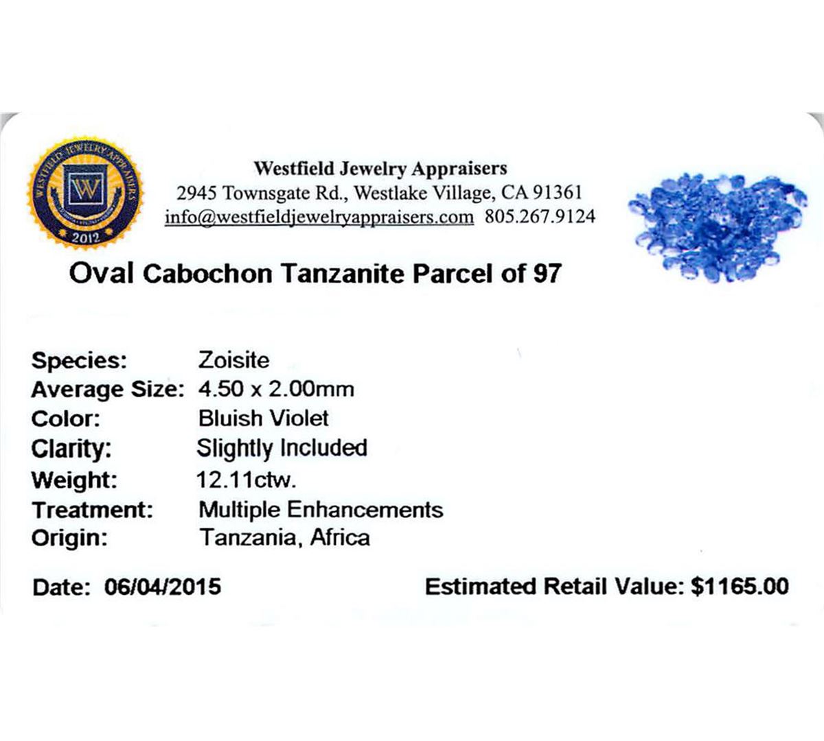 Ninety-seven oval mixed cut natural tanzanites, measuring 4.50 x 2.00 x 1.30mm, exact total weight 12.11ct., clarity is slightly included, type I, medium, very slightly grayish, bluish violet color, (GIA bV 5/3), cut is good. Transmitting light with a minimum of distortion, transparent, Naturally occurring internal & external characteristics are present. Measurements & the color grade are an average for the group. Tanzanite is a very rare gemstone that is only found in the country of Tanzania. Originally discovered in 1967. Tiffany & Company, named the stone Tanzanite. It is found in the Usumburu Mountains that border the Umba Valley of northern Tanzania. Tanzanite occurs in gray, brown, violet, blue, reddish-purple, & green. The gem is interesting because of its exceptional pleochroism. Rotated in different directions a tanzanite will exhibit multiple changes of color. Tanzanite has a low tolerance to ultrasonic cleaning, and should not be cleaned using this method. Westfield Appraised at $1,165.00.