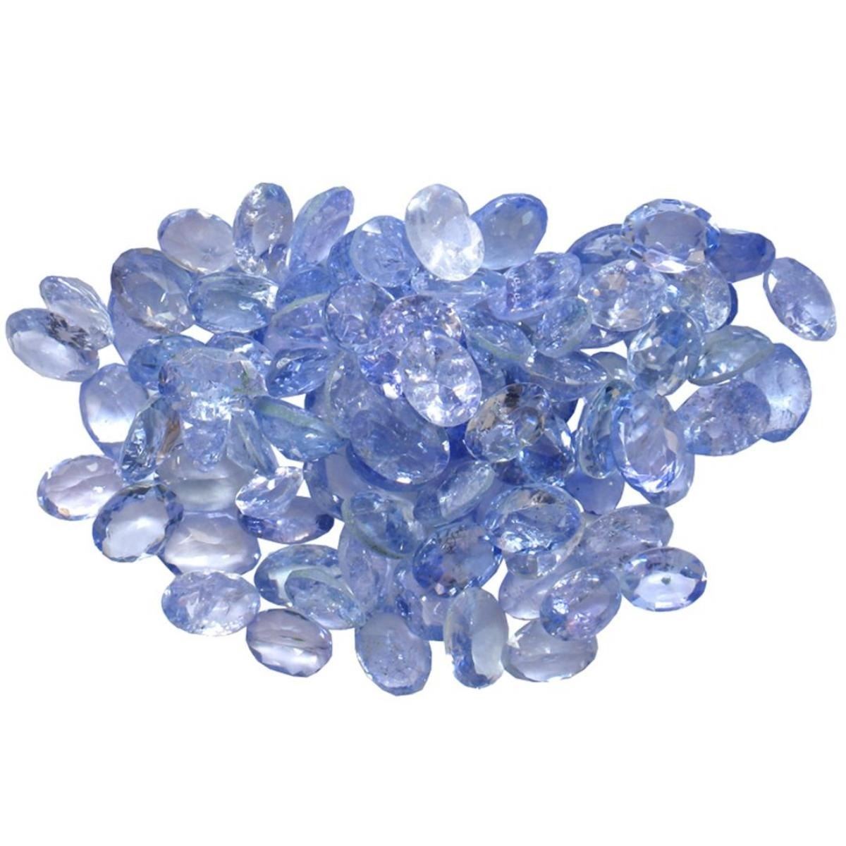 Ninety-seven oval mixed cut natural tanzanites, measuring 4.50 x 2.00 x 1.30mm, exact total weight 12.11ct., clarity is slightly included, type I, medium, very slightly grayish, bluish violet color, (GIA bV 5/3), cut is good. Transmitting light with a minimum of distortion, transparent, Naturally occurring internal & external characteristics are present. Measurements & the color grade are an average for the group. Tanzanite is a very rare gemstone that is only found in the country of Tanzania. Originally discovered in 1967. Tiffany & Company, named the stone Tanzanite. It is found in the Usumburu Mountains that border the Umba Valley of northern Tanzania. Tanzanite occurs in gray, brown, violet, blue, reddish-purple, & green. The gem is interesting because of its exceptional pleochroism. Rotated in different directions a tanzanite will exhibit multiple changes of color. Tanzanite has a low tolerance to ultrasonic cleaning, and should not be cleaned using this method. Westfield Appraised at $1,165.00.