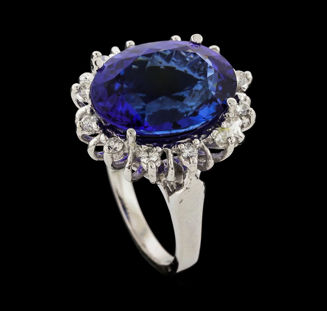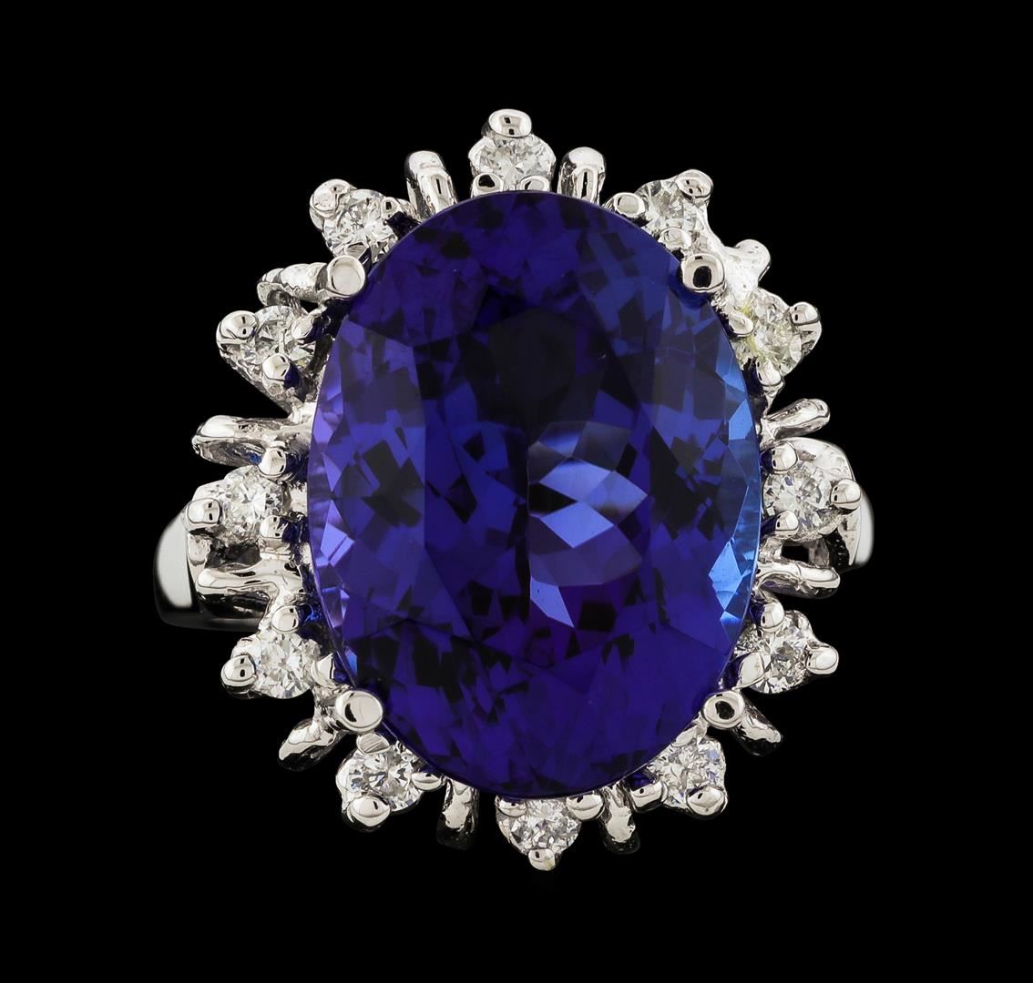 One electronically tested 14KT white gold lady's cast fashion ring with a basket halo with a bright polish finish. The featured lady's ring has a shank measuring 2.22 millimeters wide. Identified with markings of '14K'. Condition is new, good workmanship. Containing: One prong set oval modified brilliant cut natural tanzanite, measuring 16.38 x 12.19 x 8.62mm, (depth est.) approximate weight of 12.11ct., clarity is eye clean, medium dark, strong, violetish blue color, (GIA vB 6/5), cut is very good. Transmitting light with no distortion, transparent. Colored gemstones are presumed to have been subjected to commonly used enhancement processes. Graded in the setting. Twelve prong set round brilliant cut diamonds, measuring 2.10 - 2.00 x 1.23mm (depth est.) approximate total weight of 12 Stones = 0.37ct. Graded in the setting. Clarity SI-1 to SI-2. Color: H - I Cut Good. Total Weight of Colored Stones 12.11ct.. Total Weight of Diamonds 0.37ct.. Total Weight of Ring 9.10gm GAS Appraised at $20,800.00.