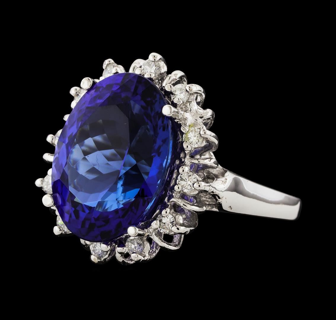 One electronically tested 14KT white gold lady's cast fashion ring with a basket halo with a bright polish finish. The featured lady's ring has a shank measuring 2.22 millimeters wide. Identified with markings of '14K'. Condition is new, good workmanship. Containing: One prong set oval modified brilliant cut natural tanzanite, measuring 16.38 x 12.19 x 8.62mm, (depth est.) approximate weight of 12.11ct., clarity is eye clean, medium dark, strong, violetish blue color, (GIA vB 6/5), cut is very good. Transmitting light with no distortion, transparent. Colored gemstones are presumed to have been subjected to commonly used enhancement processes. Graded in the setting. Twelve prong set round brilliant cut diamonds, measuring 2.10 - 2.00 x 1.23mm (depth est.) approximate total weight of 12 Stones = 0.37ct. Graded in the setting. Clarity SI-1 to SI-2. Color: H - I Cut Good. Total Weight of Colored Stones 12.11ct.. Total Weight of Diamonds 0.37ct.. Total Weight of Ring 9.10gm GAS Appraised at $20,800.00.