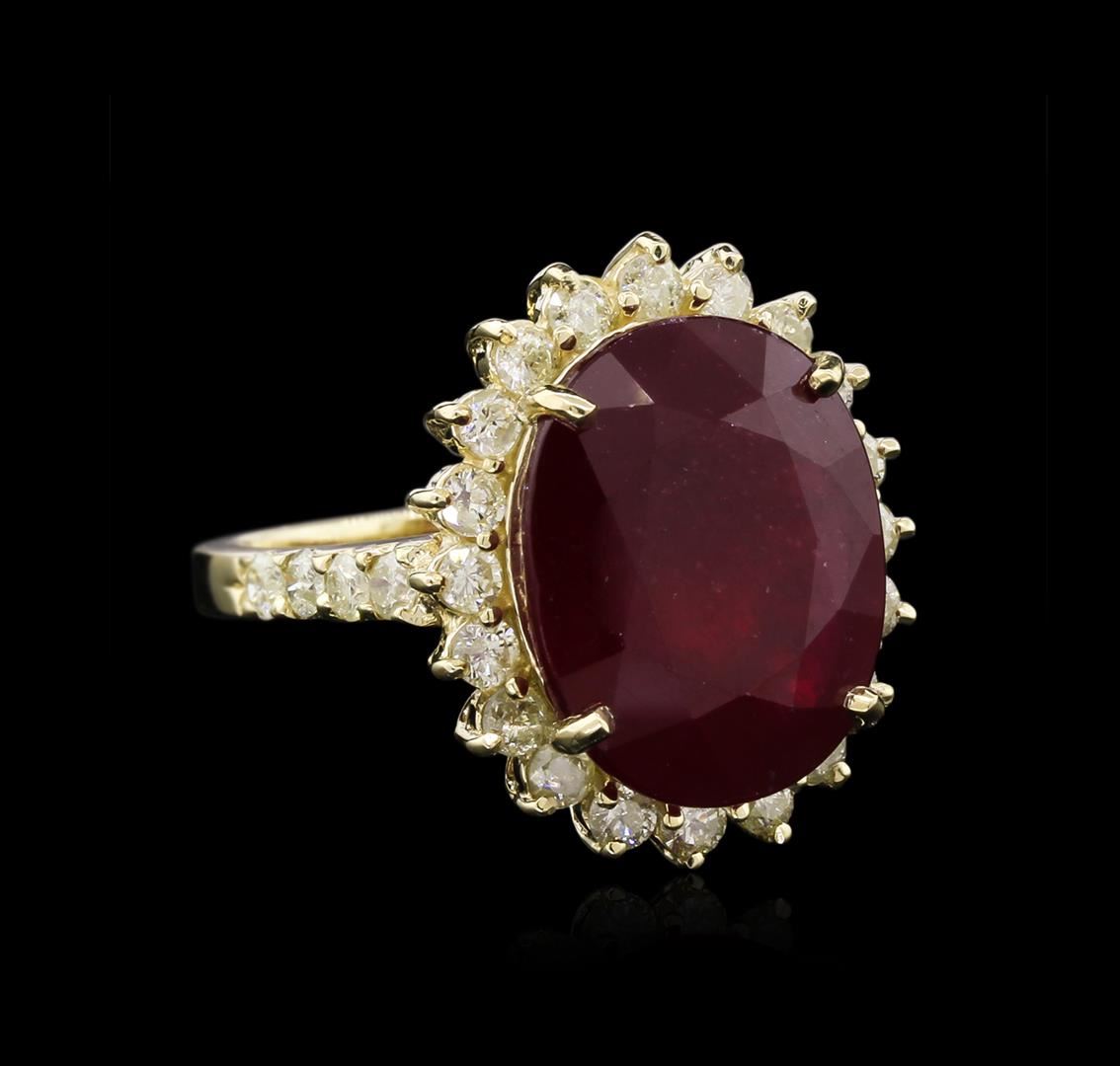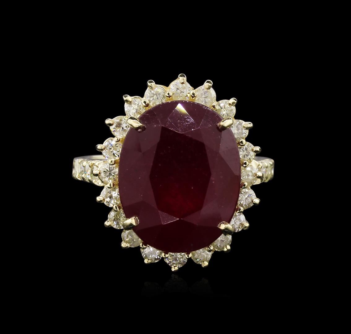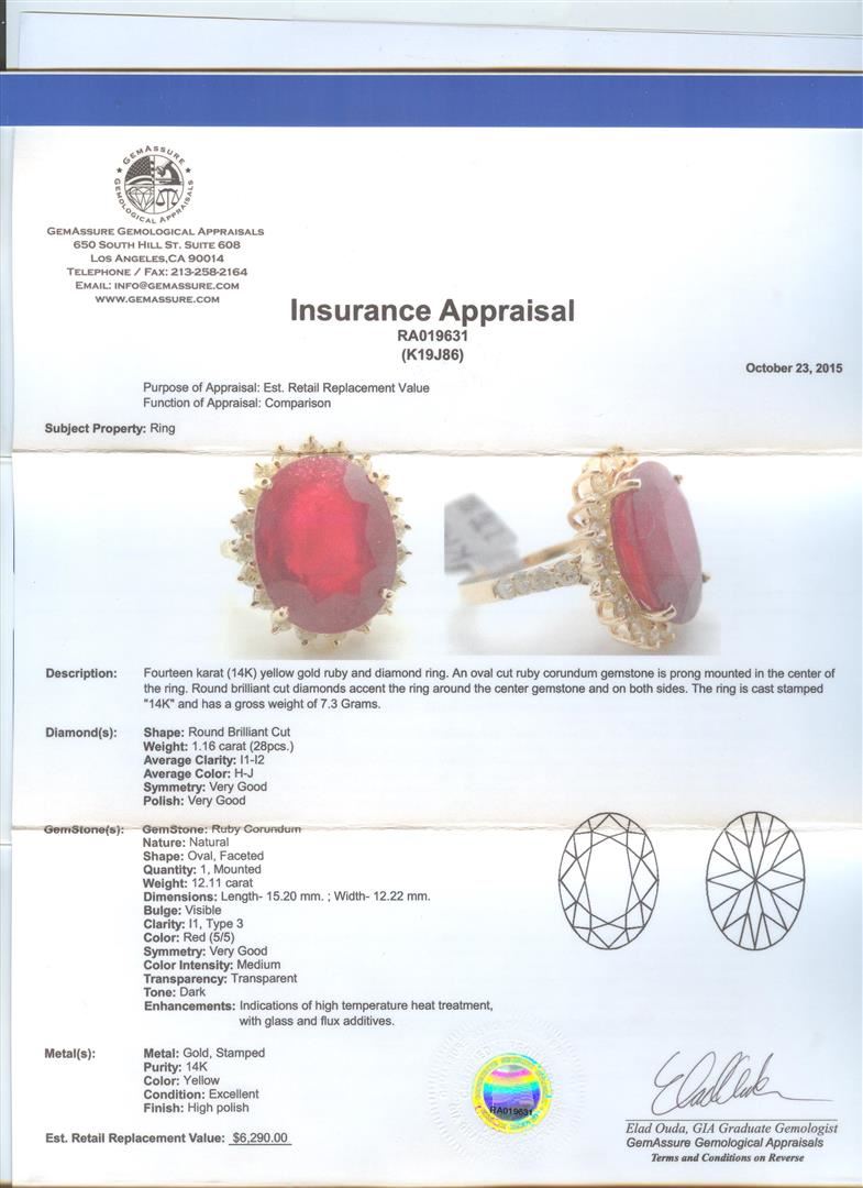 Fourteen karat (14K) yellow gold ruby and diamond ring. An oval cut ruby corundum gemstone is prong mounted in the center of the ring. Round brilliant cut diamonds accent the ring around the center gemstone and on both sides. The ring is cast stamped "14K" and has a gross weight of 7.3 Grams. Diamond(s): Shape: Round Brilliant Cut. Weight: 1.16 carat (28pcs). Average Clarity: I1-I2. Average Color: H-J. Symmetry: Very Good. Polish: Very Good. GemStone(s): Ruby Corundum. Nature: Natural. Shape: Oval, Faceted. Quantity: 1, Mounted. Weight: 12.11 carat. Dimensions: Length- 15.20 mm. ; Width 12.22 mm. Bulge: Visible. Clarity: I1, Type 3. Color: Red (5/5). Symmetry: Very Good. Color Intensity: Medium. Transparency: Transparent. Tone: Dark. Enhancements: Indications of high temperature heat treatment, with glass and flux additives. Metal(s): Metal: Gold, Stamped. Purity: 14K. Color: Yellow. Condition: Excellent. Finish: High polish. GGA Appraised at $6,290.00.