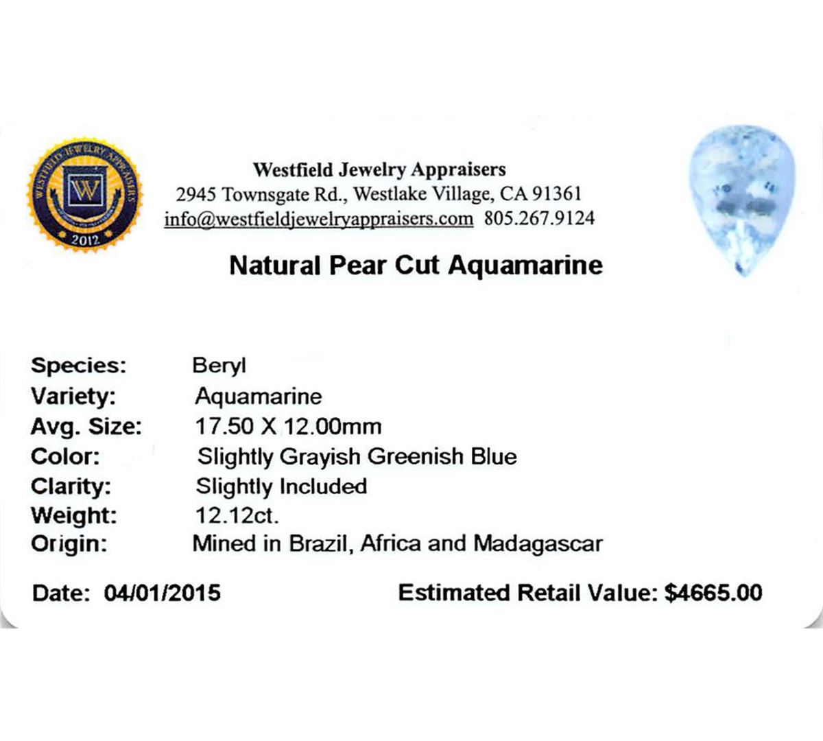 One pear cut natural aquamarine exact weight 12.12ct., clarity is slightly included, type I, medium, very slightly grayish, very slightly greenish blue color, (GIA vslgB 5/3), cut is good. Westfield Appraised at $4,665.00.