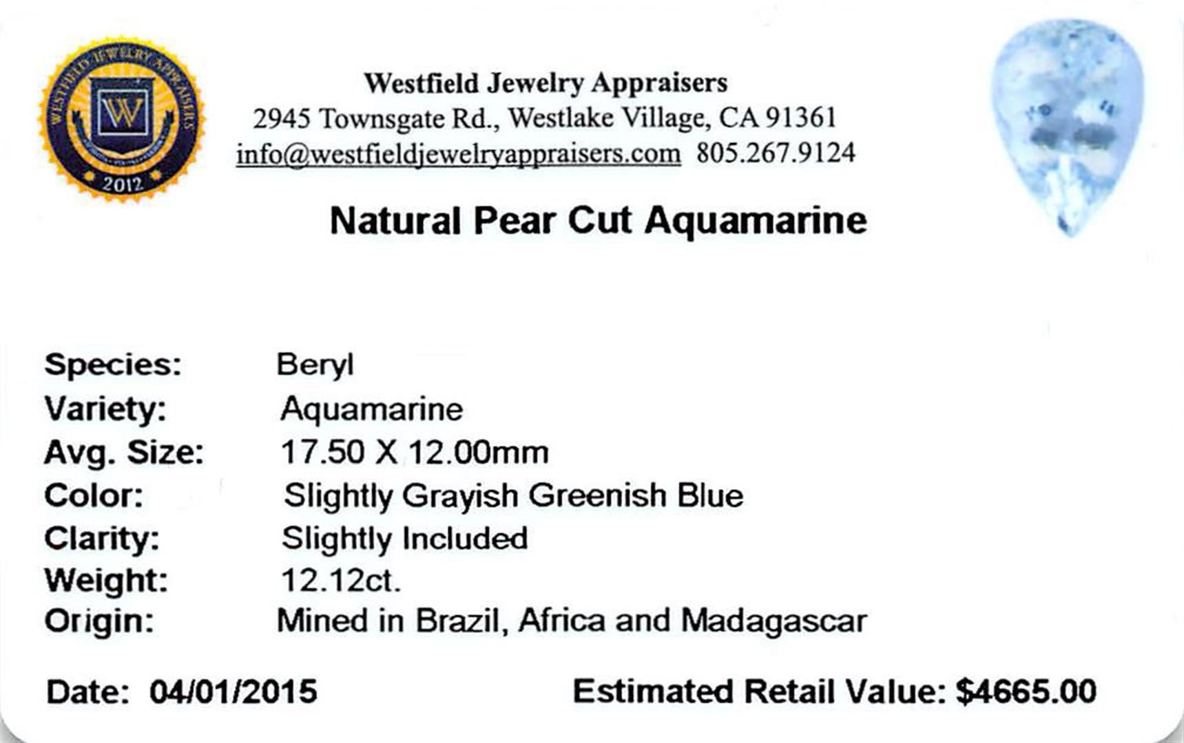 One pear cut natural aquamarine exact weight 12.12ct., clarity is slightly included, type I, medium, very slightly grayish, very slightly greenish blue color, (GIA vslgB 5/3), cut is good. Westfield Appraised at $4,665.00.
