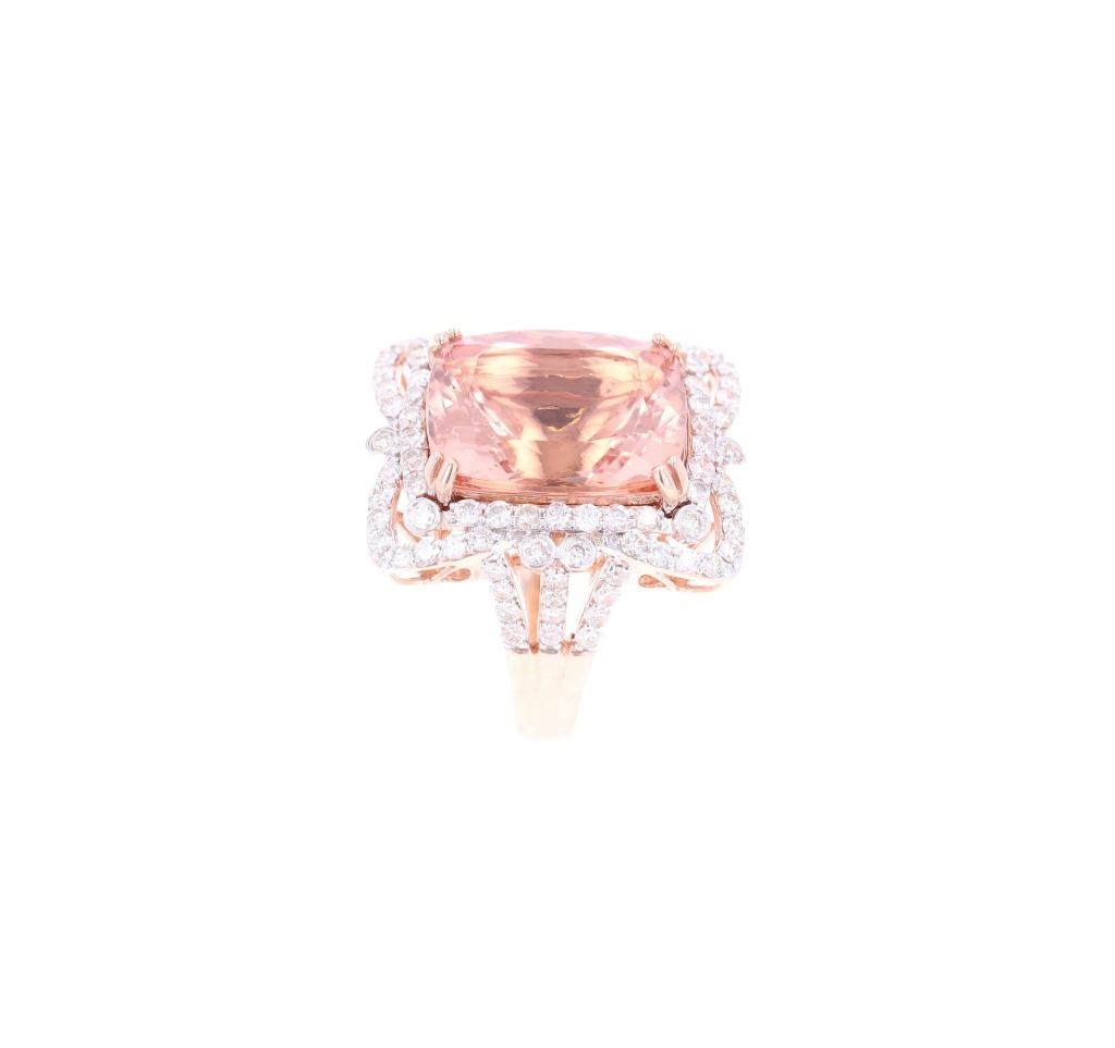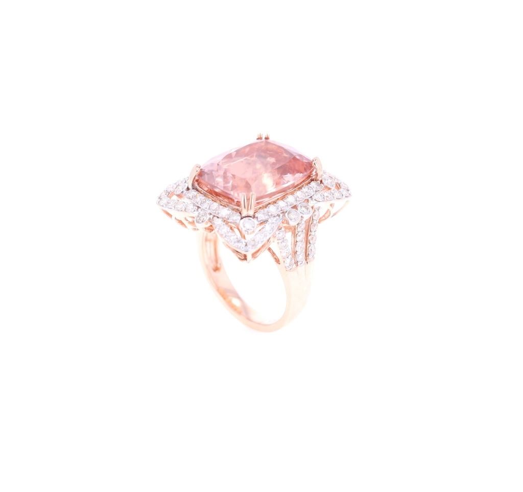 Featured in this lot is this 12.12ct morganite VS1 diamond and 14k two tone gold ring with GGA paperwork. The ring features a polished, stamped, and tested 14k two tone gold construction that is marked as follows: Oscar Friedman - 14k. The ring features a center stone of natural rectangular cushion, faceted cut morganite gemstone with measurements of 16.21 x 13.18mm that is considered type I and shows a Pinkish Orange coloration and shows a total weight of 12.12ct. The center stone is decorated with a total of 92 round brilliant cut diamonds that shows measurements of 1.9 x 1.5mm and shows a clarity of VS1 - SI1 and a coloration of G - H and a total weight of 1.79ct. The piece comes complete with GGA(GemAssure Gemological Appraisals, GGA Appraisal Number#: GGA050492 and trace number: K28E98) report and appraisal confirming the above info and giving a total value of $10,240.00. The collective weight of this ring is 12.1g and the ring size is US 7. RN037439.