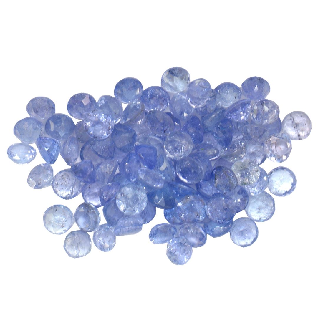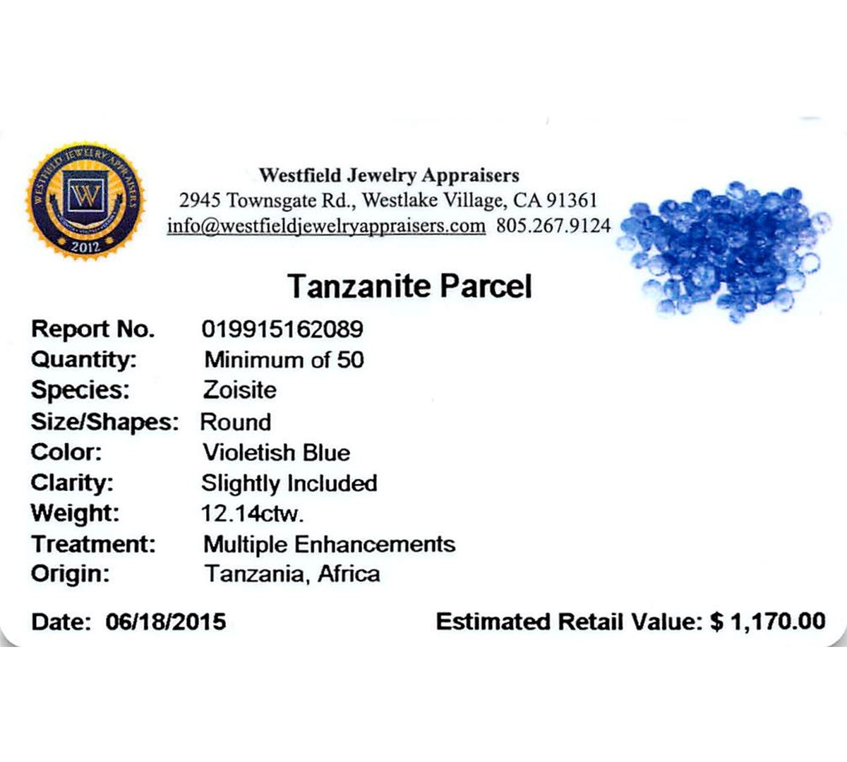 Fifty round mixed cut natural tanzanites exact total weight 12.14ct., clarity is slightly included, type I, medium dark, slightly grayish, violetish blue color, (GIA vB 6/2), cut is good. Measurements & the color grade are an average for the group, Color grade is an average for the group, Naturally occurring internal & external characteristics are present, Indications of laboratory high temperature heat treatment. Westfield Appraised at $1,170.00.