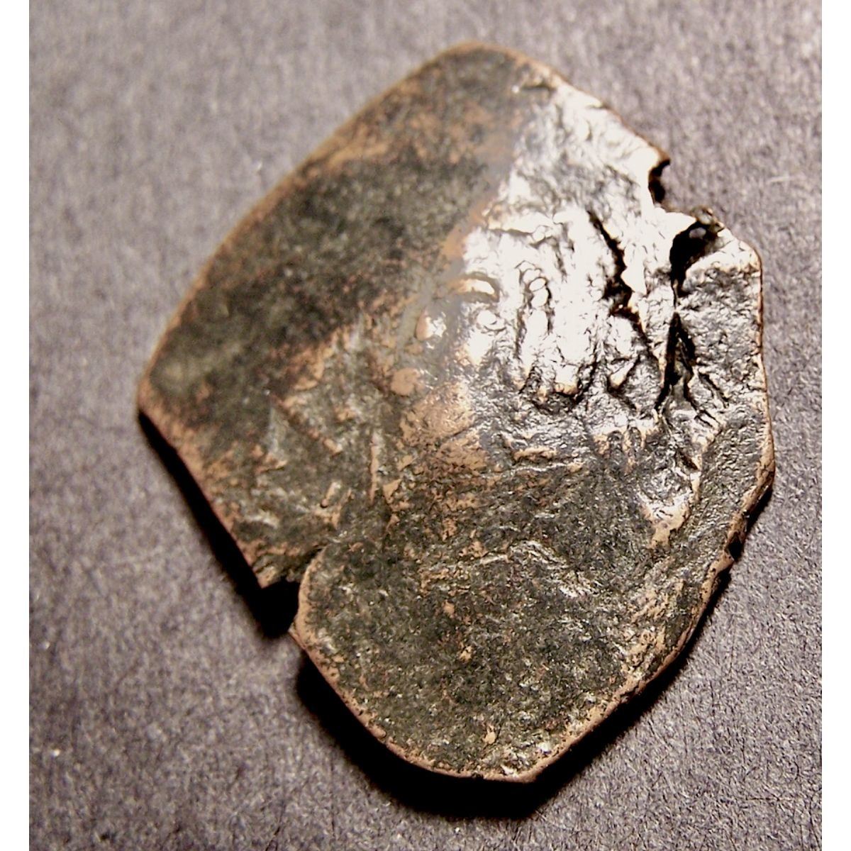 12th - 14th Century A.D. Medieval Byzantine trachy "cup" coin. 20-28 mm diameter. 2.82 gram weight.  Trachy or "cup" coins are odd shaped coins looking like they could have been formed by taking a normal coin & pushing a thumb into the center of the coin. Stuck during the 11th-14th centuries, no one is certain why they were made in this shape, but most likely to reduce counterfeiting. Many of these coins are made of a mixture of copper and billon ( a debased silver, sometimes about 20% ) but most of the time the amount of silver was so small the coins would mainly appear as copper or bronze. Because of their shape, the picture inside the bowl gets less wear than the outside design. Many of these coins depict Christ wearing a halo (nimbate) on the outside, or sometimes Mother Mary. The inside usually had a depiction of the Emperor often with his Empress.Â
