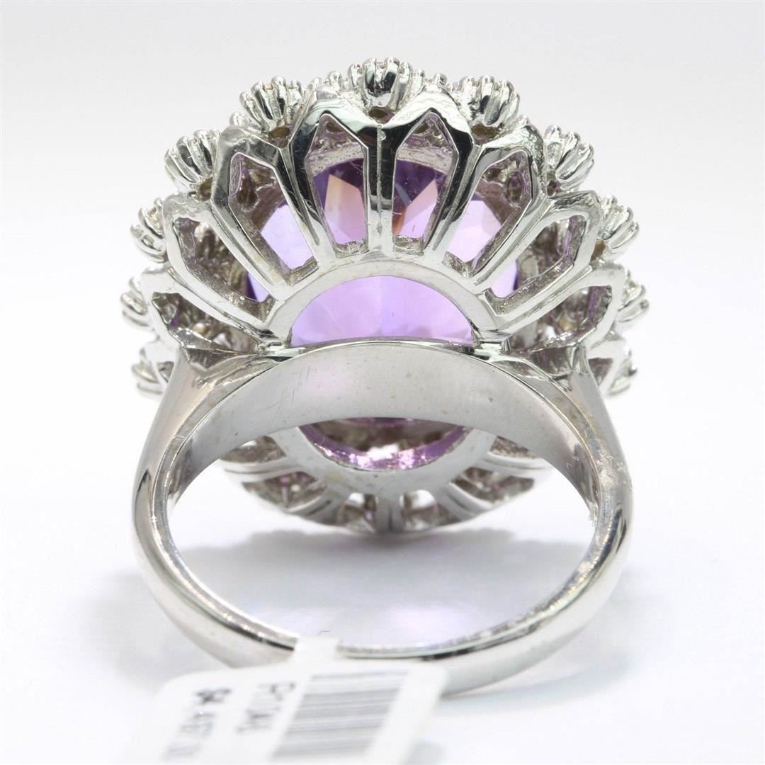 One lady's band ring featuring: 14KT white gold weighing 11.20 grams containing one amethyst weighing 12.15ct and 32 diamonds weighing 1.11ctw. The amethyst is oval brilliant cut with good clarity, excellent cut and purple color and measures approximately