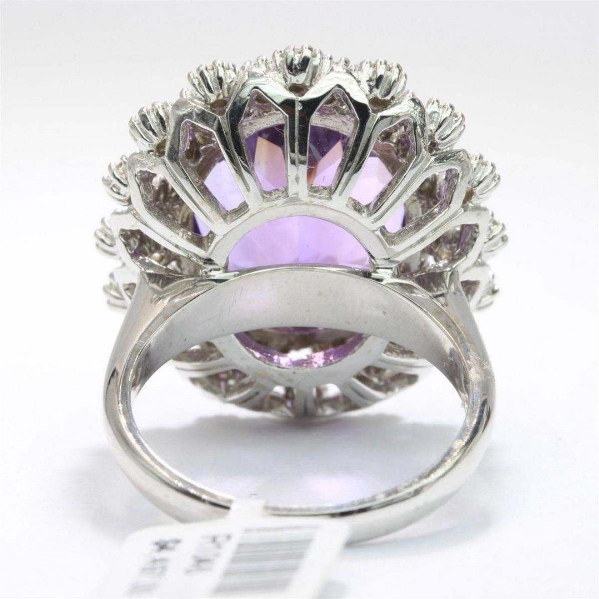 One lady's band ring featuring: 14KT white gold weighing 11.20 grams containing one amethyst weighing 12.15ct and 32 diamonds weighing 1.11ctw. The amethyst is oval brilliant cut with good clarity, excellent cut and purple color and measures approximately 16.00mm x 13.60mm. The diamonds are round brilliant cut and are natural, unenhanced stones with SI clarity, G color and excellent cut. Ring size is 6.5 but is resizable.