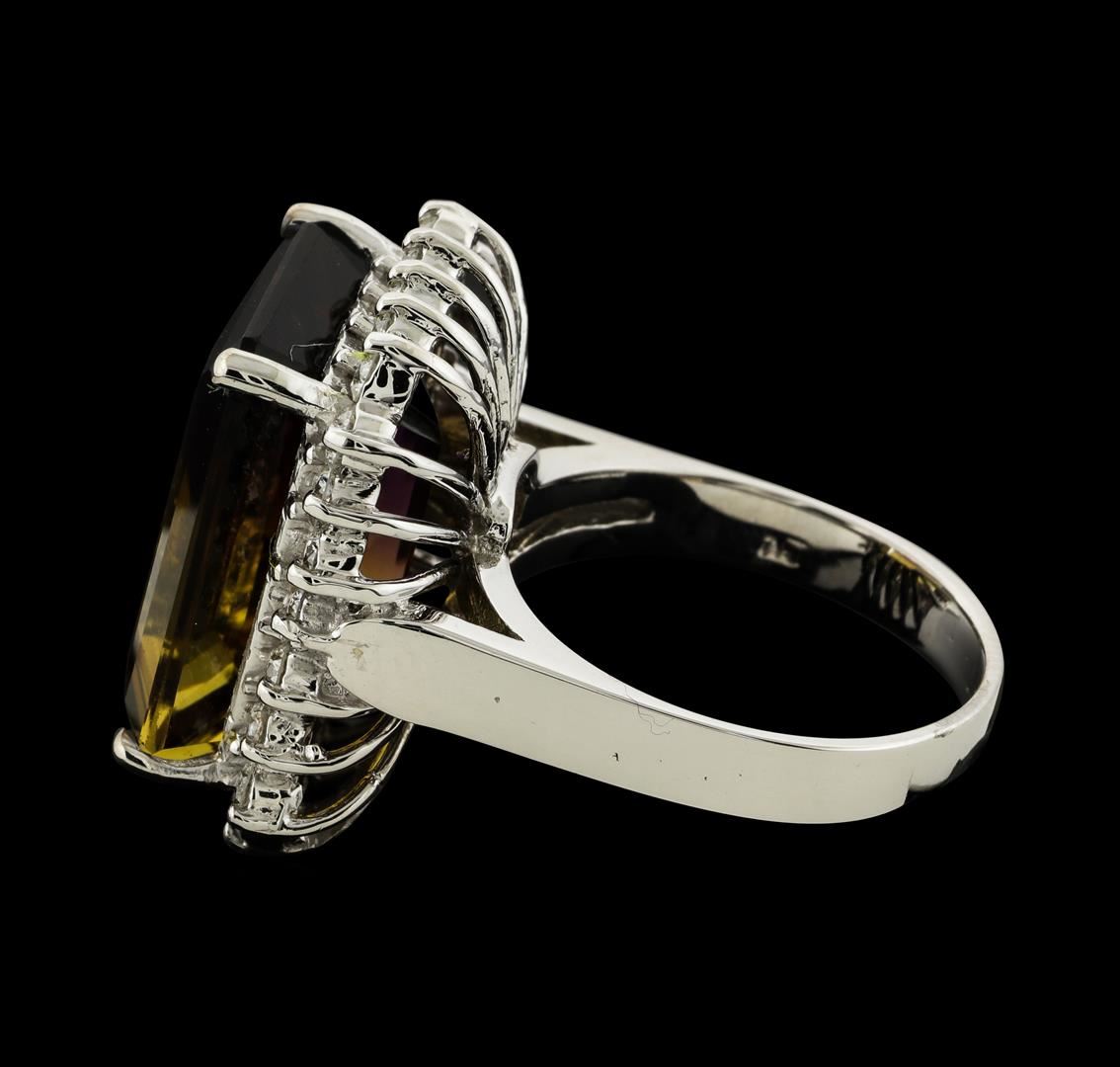 One electronically tested 14KT white gold lady's cast fashion ring with a cathedral shank with a basket halo with a bright polish finish. The featured lady's ring has a shank measuring 2.75 millimeters wide. Identified with markings of '14K'. Condition is new, good workmanship. Containing: One prong set emerald standard step cut natural ametrine quartz, measuring 16.33 x 12.43 x 8.17mm, (depth est.) approximate weight of 12.15ct., clarity is eye clean, medium, strong, purple color, (GIA P 5/5) to medium, moderately strong, orangy yellow, (GIA oY 5/4), cut is very good. Transmitting light with no distortion, transparent. Indications of laboratory high temperature heat treatment. Colored gemstones are presumed to have been subjected to commonly used enhancement processes. Graded in the setting. Twenty-Four prong set round brilliant cut diamonds, measuring 2.30 - 2.20 x 1.37mm (depth est.) approximate total weight of 24 Stones = 1.01ct. Graded in the setting. Clarity SI-1 to I-1. Color: G - H Cut Good. Total Weight of Colored Stones 12.15ct.. Total Weight of Diamonds 1.01ct.. Total Weight of Ring 9.90gm. GAS Appraised at $4,050.00.