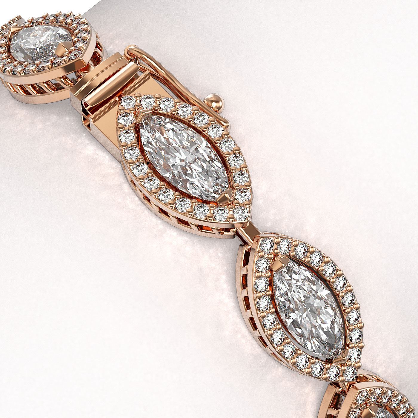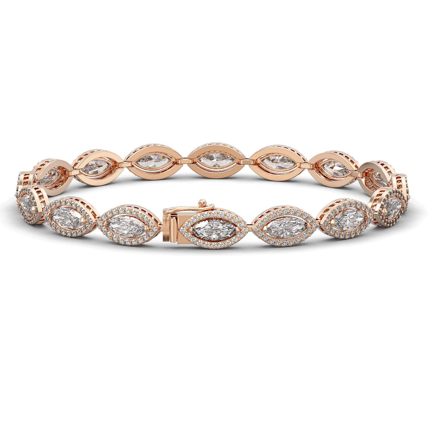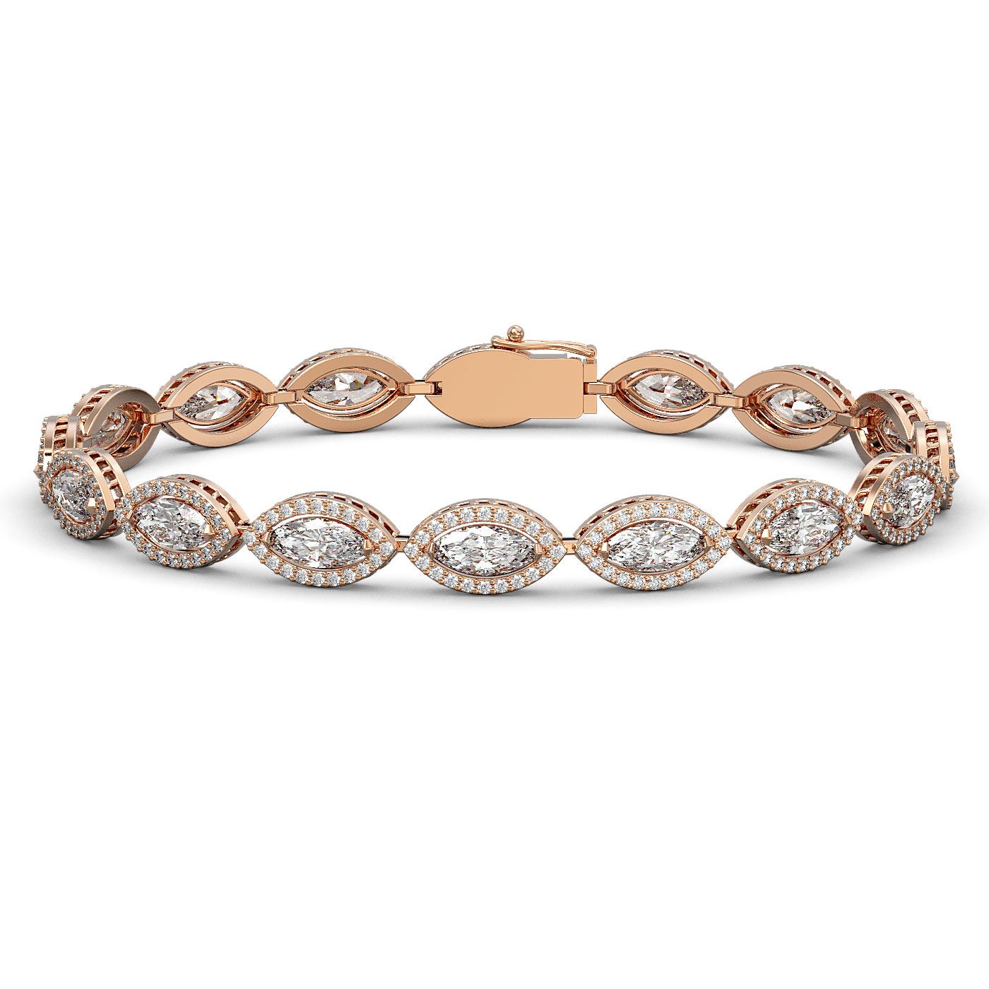 REF-2256M2H -42744 ---- 12.16 CTW Marquise Diamond Designer Bracelet 18K Rose Gold ---- Luxury Designer Brand Bracelet Appraised at $99,250 Certificate Number US42744 18K Rose gold, Bracelet Size is 7 Inches, Bracelet measuring approx. 7 mm x 7 Inches, weighing in total approx. 17 grams. Made in the USA and is stamped 18K, Main stone 9.6 carat total weight containing 16 pieces of I-J color with VS/SI quality Marquise shape cut Diamond , Stone #2 2.56 carat total weight containing 320 pieces of G-H color with VS/SI quality Round shape cut Diamond