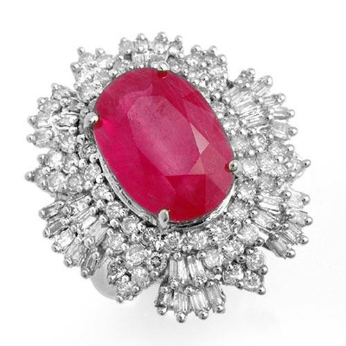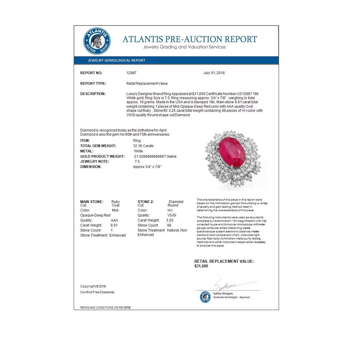 REF-441N6Y -12967 ---- 12.16 CTW Ruby & Diamond Ring 18K White Gold ---- Luxury Designer Brand Ring Appraised at $31,600 Certificate Number US12967 18k White gold, Ring Size is 7.5, Ring measuring approx. 3/4" x 7/8" , weighing in total approx. 19 grams. Made in the USA and is stamped 18k, Main stone 8.91 carat total weight containing 1 pieces of Mid-Opaque-Deep Red color with AAA quality Oval shape cut Ruby , Stone #2 3.25 carat total weight containing 98 pieces of H-I color with VS/SI quality Round shape cut Diamond