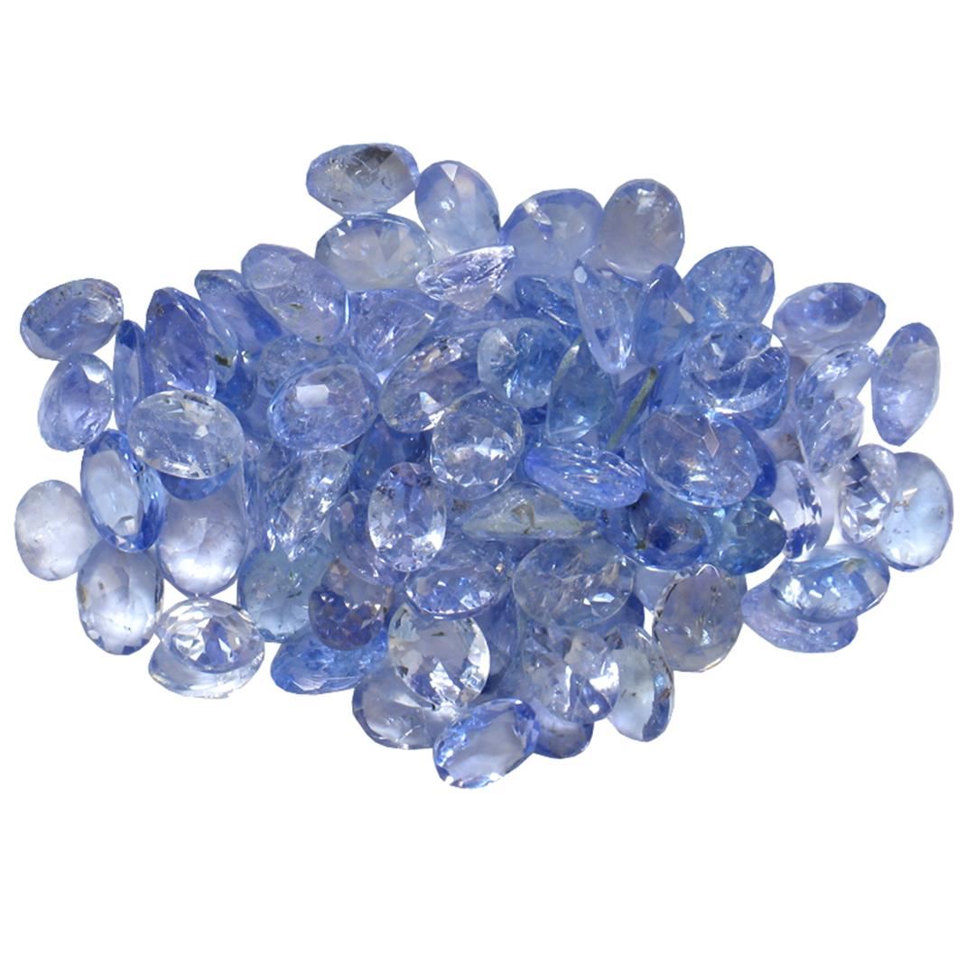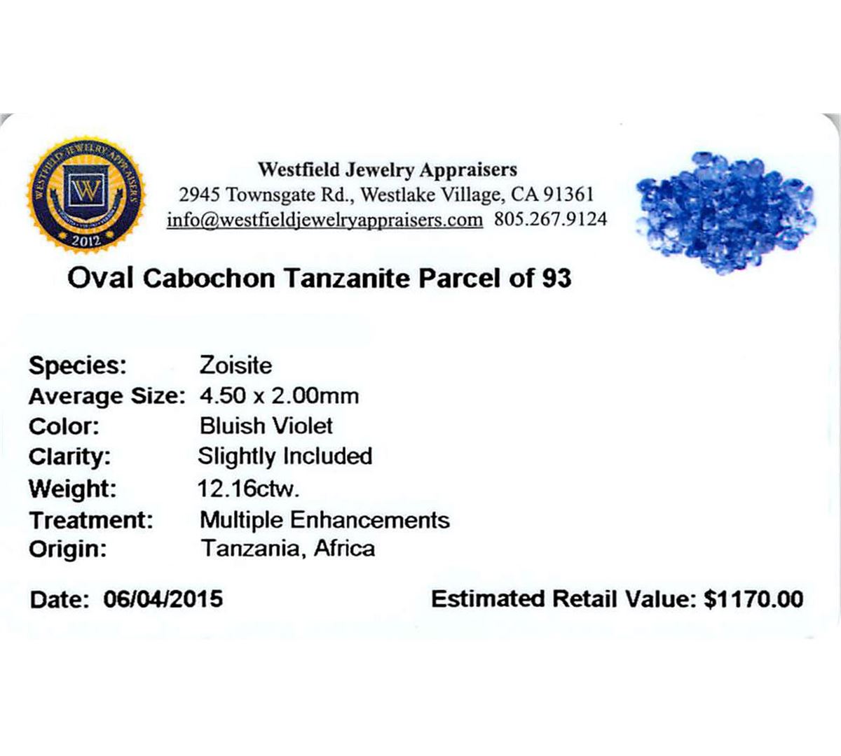 Ninety-three oval mixed cut natural tanzanites, measuring 4.50 x 2.00 x 1.30mm, exact total weight 12.16ct., clarity is slightly included, type I, medium, very slightly grayish, bluish violet color, (GIA bV 5/3), cut is good. Transmitting light with a minimum of distortion, transparent, Naturally occurring internal & external characteristics are present. Measurements & the color grade are an average for the group. Tanzanite is a very rare gemstone that is only found in the country of Tanzania. Originally discovered in 1967. Tiffany & Company, named the stone Tanzanite. It is found in the Usumburu Mountains that border the Umba Valley of northern Tanzania. Tanzanite occurs in gray, brown, violet, blue, reddish-purple, & green. The gem is interesting because of its exceptional pleochroism. Rotated in different directions a tanzanite will exhibit multiple changes of color. Tanzanite has a low tolerance to ultrasonic cleaning, and should not be cleaned using this method. Westfield Appraised at $1,170.00.