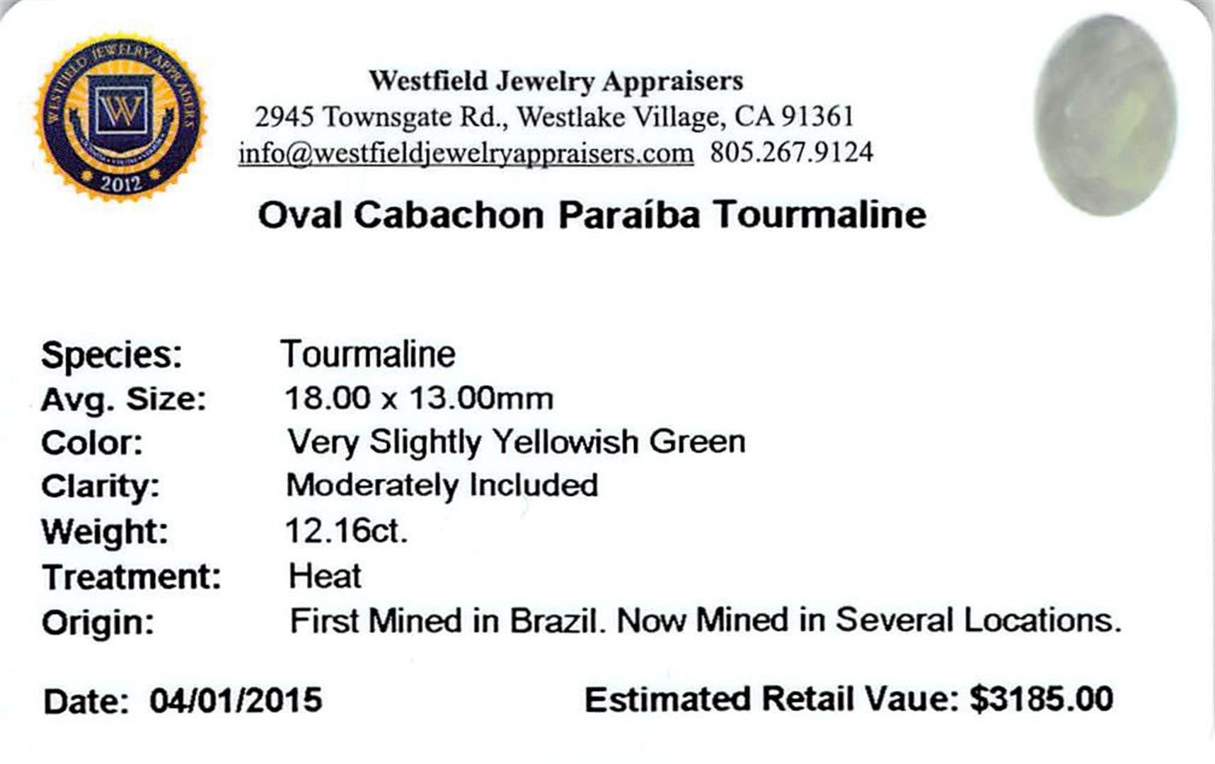One oval cut natural Paraiba tourmaline exact weight 12.16ct., clarity is moderately included, cut is good. Westfield Appraised.