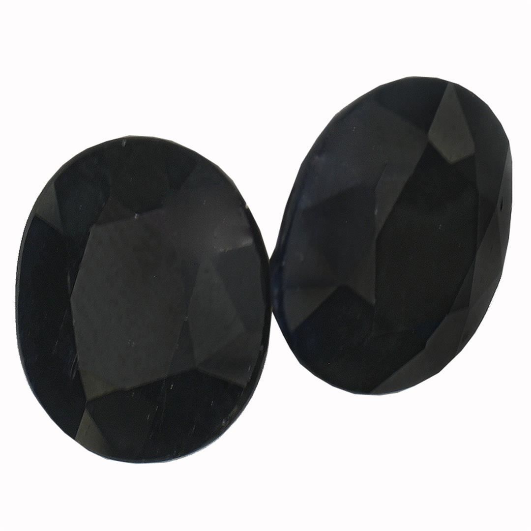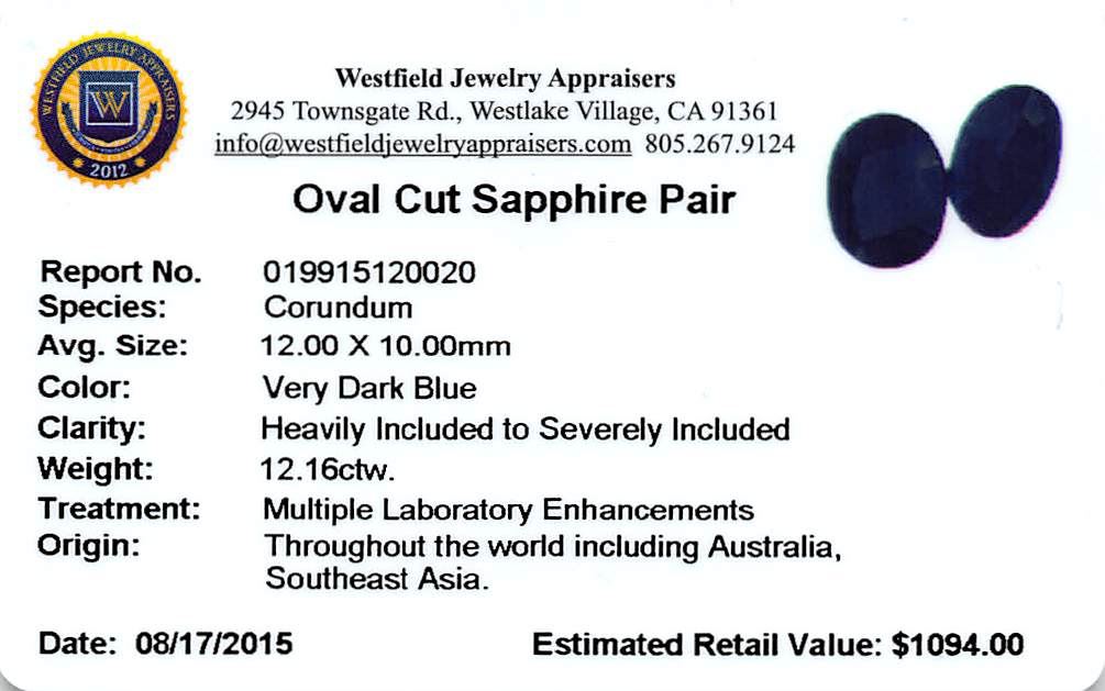 Two oval cut sapphires, measuring 12.00 x 10.00mm, approximate total weight of 12.16ct., clarity is heavily included to severely included, very dark blue color. Indications of multiple laboratory enhancements. Westfield Appraised at $1,094.00.