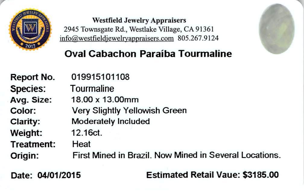 One oval cut natural Paraiba tourmaline exact weight 12.16ct., clarity is moderately included, cut is good. Westfield Appraised at $3,185.00.