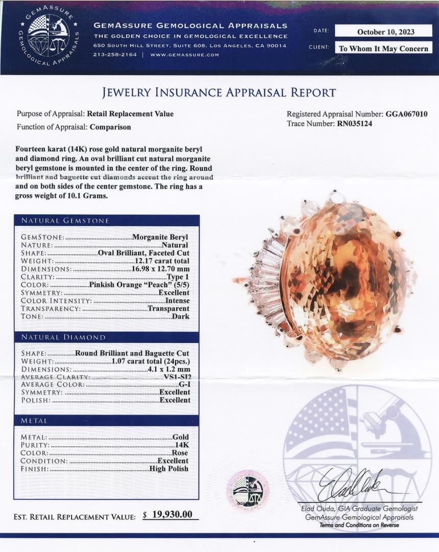 Fourteen karat (14K) rose gold natural morganite beryl and diamond ring. An oval brilliant cut natural morganite beryl gemstone is mounted in the center of the ring. Round brilliant and baguette cut diamonds accent the ring around and on both sides of the center gemstone. The ring has a gross weight of 10.1 Grams. #NATURAL GEMSTONE# GEMSTONE: Morganite Beryl; NATURE: Natural; SHAPE: Oval Brilliant, Faceted Cut; WEIGHT: 2.17 carat total; DIMENSIONS: 16.98 x 12.70mm; CLARITY: Type 1; COLOR: Pinkish Orange "Peach" (5/5); SYMMETRY: Excellent; COLOR INTENSITY: Intense; TRANSPARENCY: Transparent; TONE: Dark #NATURAL DIAMOND# SHAPE: Round Brilliant and Baguette Cut; WEIGHT: 1.07 carat total (24pcs.); DIMENSIONS: 4.1 x 1.2mm; AVERAGE CLARITY: VS1-SI2; AVERAGE COLOR: G-I; SYMMETRY: Excellent; POLISH: Excellent #METAL# METAL: Gold; PURITY: 14K; COLOR: Rose; CONDITION: Excellent; FINISH: High Polish #Size: 6.5