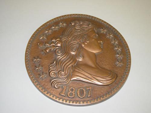 12" 1807 LIBERTY HEAD COIN PLAQUE-COPPER COLORED COMPOSITION MADE BY BURWOOD PRODUCTS CO.-U.S.A.