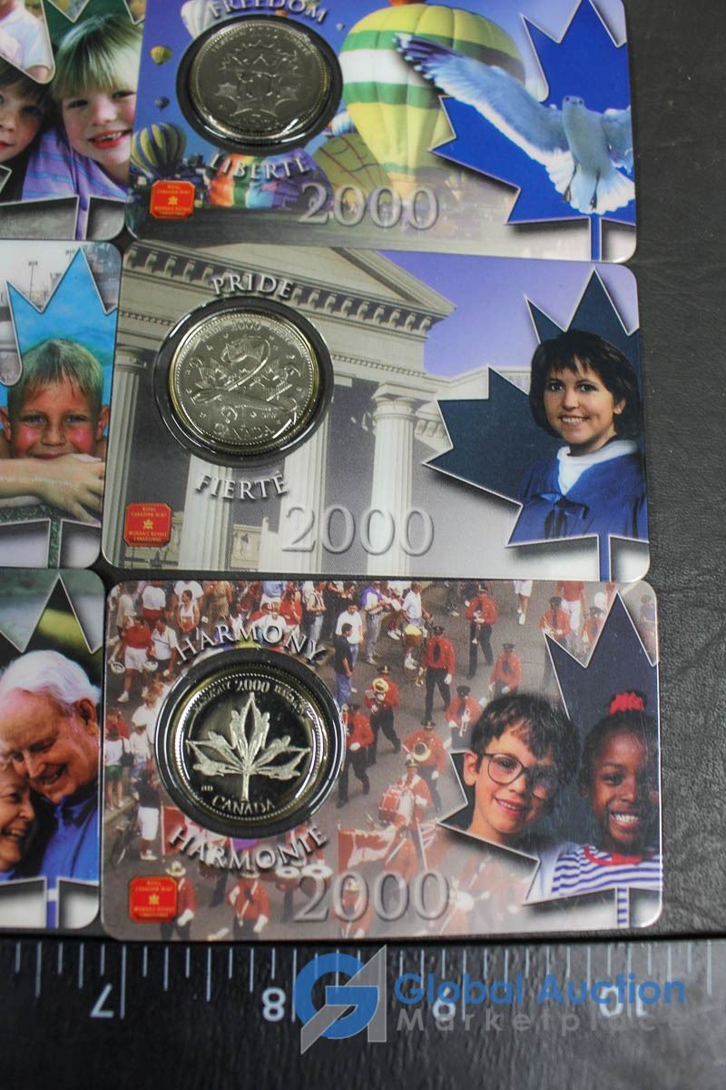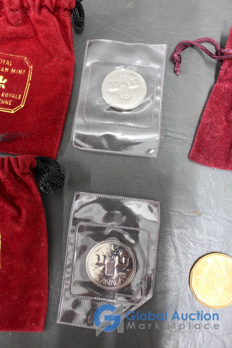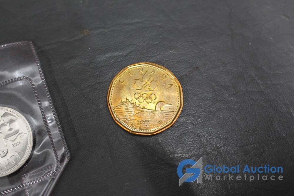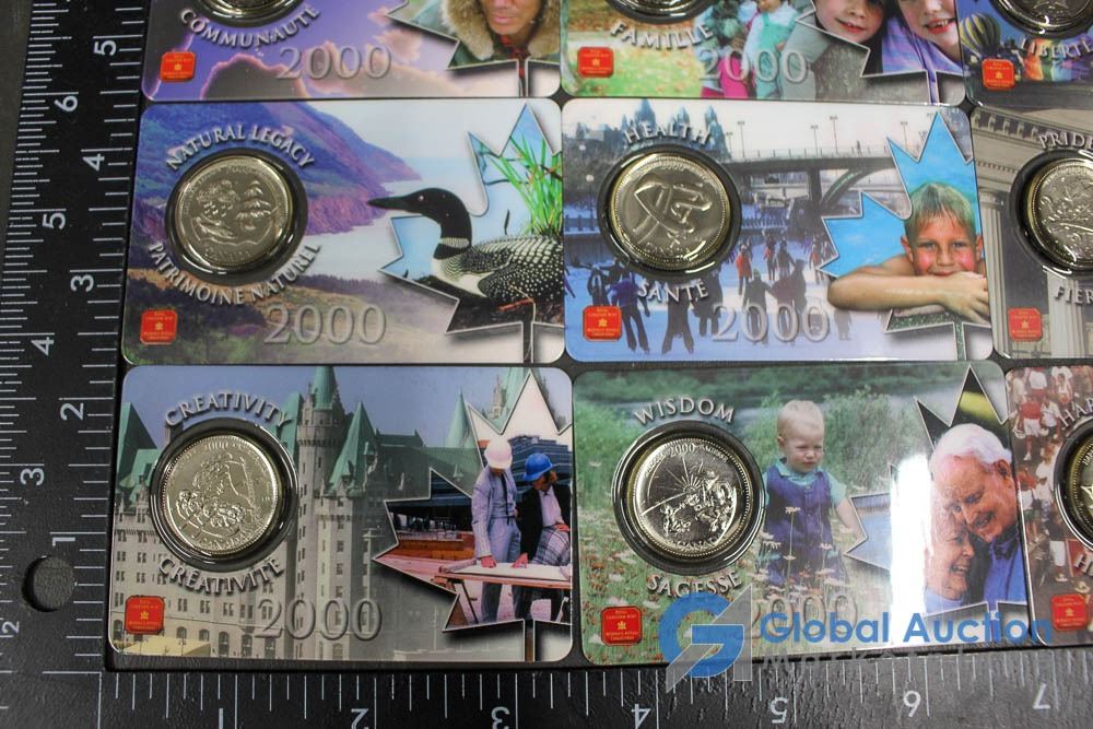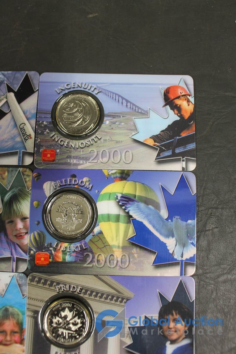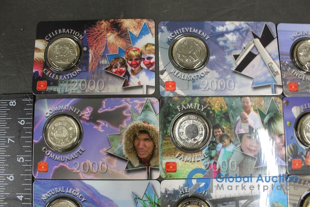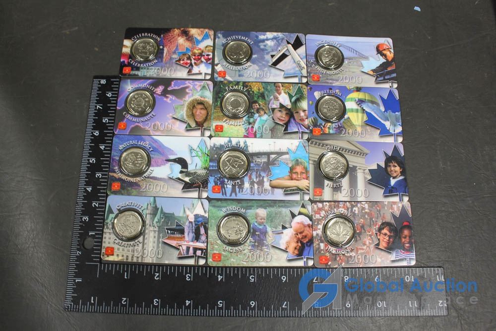 (12) 2000 25 Cent Collector Cards, (4) 2004 Moose Quarters, (1) Loonie, Assorted Fifty Cent Pieces and More