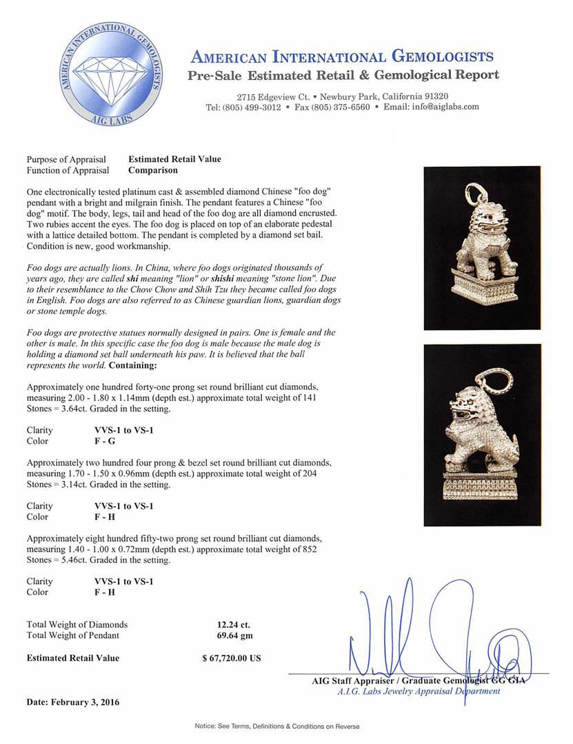One electronically tested platinum cast & assembled diamond Chinese "Foo Dog" pendant with a bright and milgrain finish. The pendant features a Chinese "Foo Dog" motif. The body, legs, tail, and head of the foo dog are all diamond encrusted. Two rubies accent the eyes. The foo dog is placed on top of an elaborate pedestal with a lattice detailed bottom. The pendant is completed by a diamond set bail. Condition is new, good workmanship. Foo Dogs are actually lions. In China, where Foo Dogs originated thousands of years ago they are called shi meaning "lion" or shishi meaning "stone lion". Due to their resemblance to the Chow Chow and Shih Tzu they became called foo dogs in English. Foo dogs are also referred to as Chinese guardian lions, guardian dogs or stone temple dogs. Foo dogs are protective statues normally designed in pairs. One is female and the other is male. In this specific case the foo dog is male because the male dog is holding a diamond set ball underneath his paw. It is believed that the ball represents the world. Condition is new, good workmanship. Containing: One Hundred Forty-One prong set round brilliant cut diamonds, measuring 2.00 - 1.80 x 1.14mm (depth est.) approximate total weight of 141 Stones = 3.64ct. Graded in the setting. Clarity: VVS-1 to VS-1. Color: F - G Two Hundred Four prong & bezel set round brilliant cut diamonds, measuring 1.70 - 1.50 x 0.96mm (depth est.) approximate total weight of 204 Stones = 3.14ct. Graded in the setting. Clarity: VVS-1 to VS-1. Color: F - H Eight Hundred Fifty-Two prong set round brilliant cut diamonds, measuring 1.40 - 1.00 x 0.72mm (depth est.) approximate total weight of 852 Stones = 5.46ct. Graded in the setting. Clarity: VVS-1 to VS-1. Color: F - H. Total Weight of Diamonds 12.24ct. Total Weight of Pendant 69.64gm. AIG Appraised at $67,720.00.