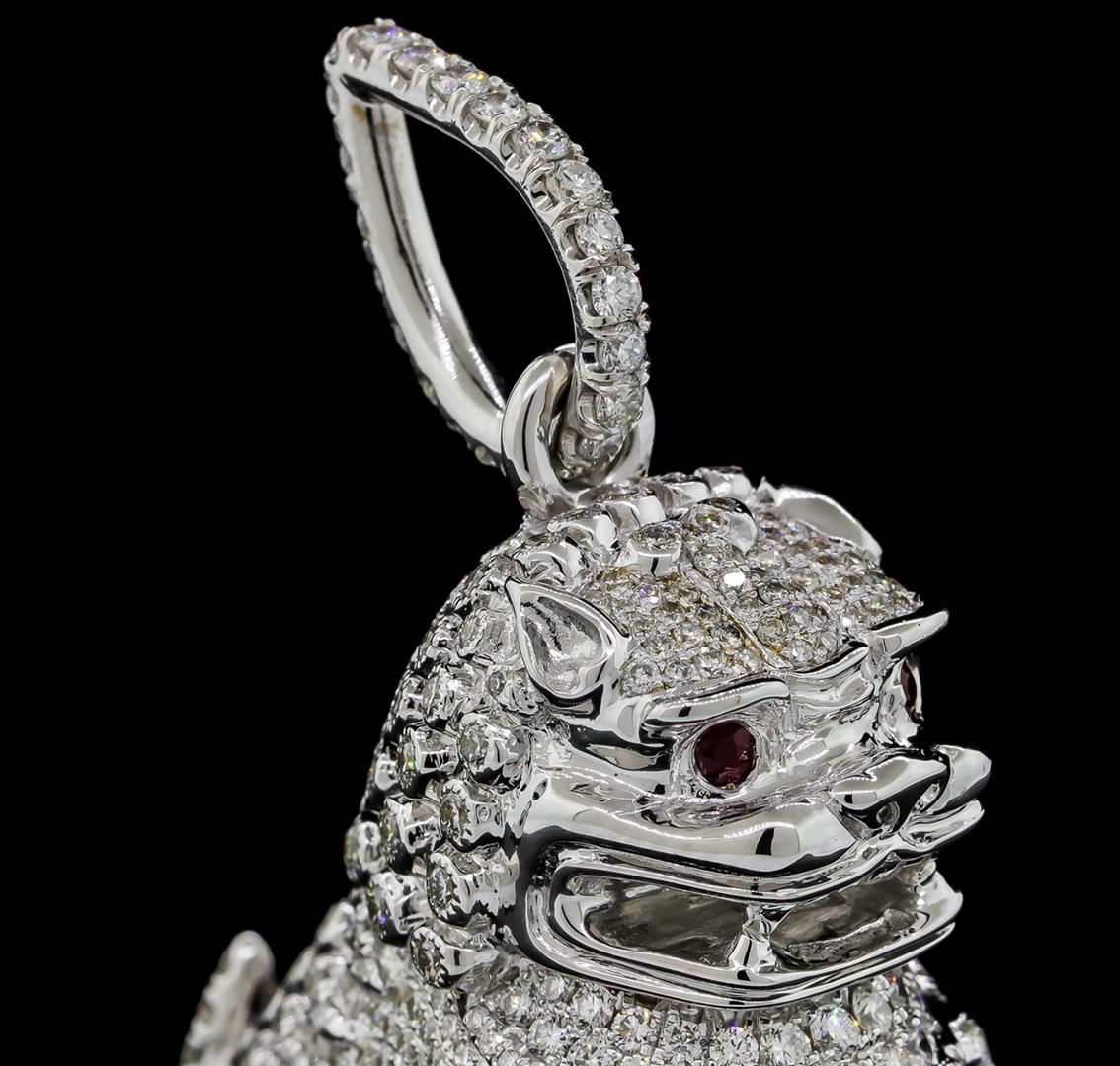 One electronically tested platinum cast & assembled diamond Chinese "Foo Dog" pendant with a bright and milgrain finish. The pendant features a Chinese "Foo Dog" motif. The body, legs, tail, and head of the foo dog are all diamond encrusted. Two rubies accent the eyes. The foo dog is placed on top of an elaborate pedestal with a lattice detailed bottom. The pendant is completed by a diamond set bail. Condition is new, good workmanship. Foo Dogs are actually lions. In China, where Foo Dogs originated thousands of years ago they are called shi meaning "lion" or shishi meaning "stone lion". Due to their resemblance to the Chow Chow and Shih Tzu they became called foo dogs in English. Foo dogs are also referred to as Chinese guardian lions, guardian dogs or stone temple dogs. Foo dogs are protective statues normally designed in pairs. One is female and the other is male. In this specific case the foo dog is male because the male dog is holding a diamond set ball underneath his paw. It is believed that the ball represents the world. Condition is new, good workmanship. Containing: One Hundred Forty-One prong set round brilliant cut diamonds, measuring 2.00 - 1.80 x 1.14mm (depth est.) approximate total weight of 141 Stones = 3.64ct. Graded in the setting. Clarity: VVS-1 to VS-1. Color: F - G Two Hundred Four prong & bezel set round brilliant cut diamonds, measuring 1.70 - 1.50 x 0.96mm (depth est.) approximate total weight of 204 Stones = 3.14ct. Graded in the setting. Clarity: VVS-1 to VS-1. Color: F - H Eight Hundred Fifty-Two prong set round brilliant cut diamonds, measuring 1.40 - 1.00 x 0.72mm (depth est.) approximate total weight of 852 Stones = 5.46ct. Graded in the setting. Clarity: VVS-1 to VS-1. Color: F - H. Total Weight of Diamonds 12.24ct. Total Weight of Pendant 69.64gm. AIG Appraised at $67,720.00.