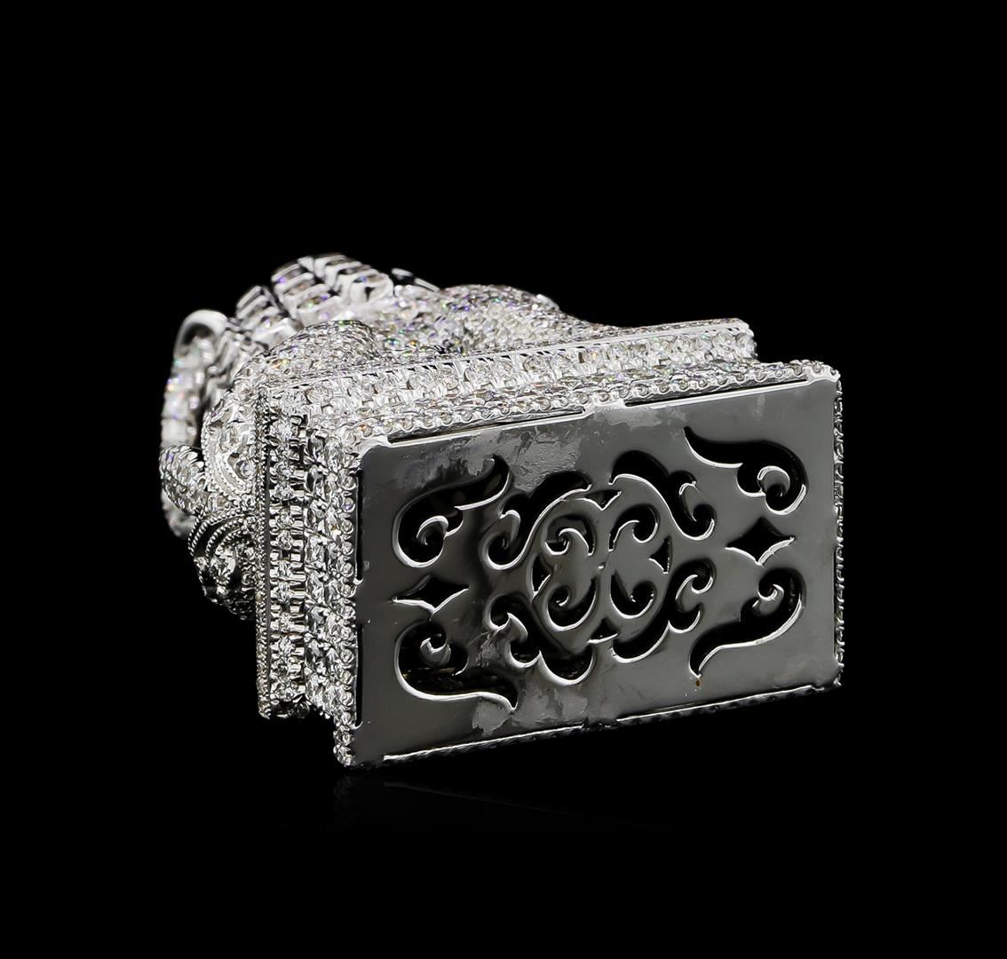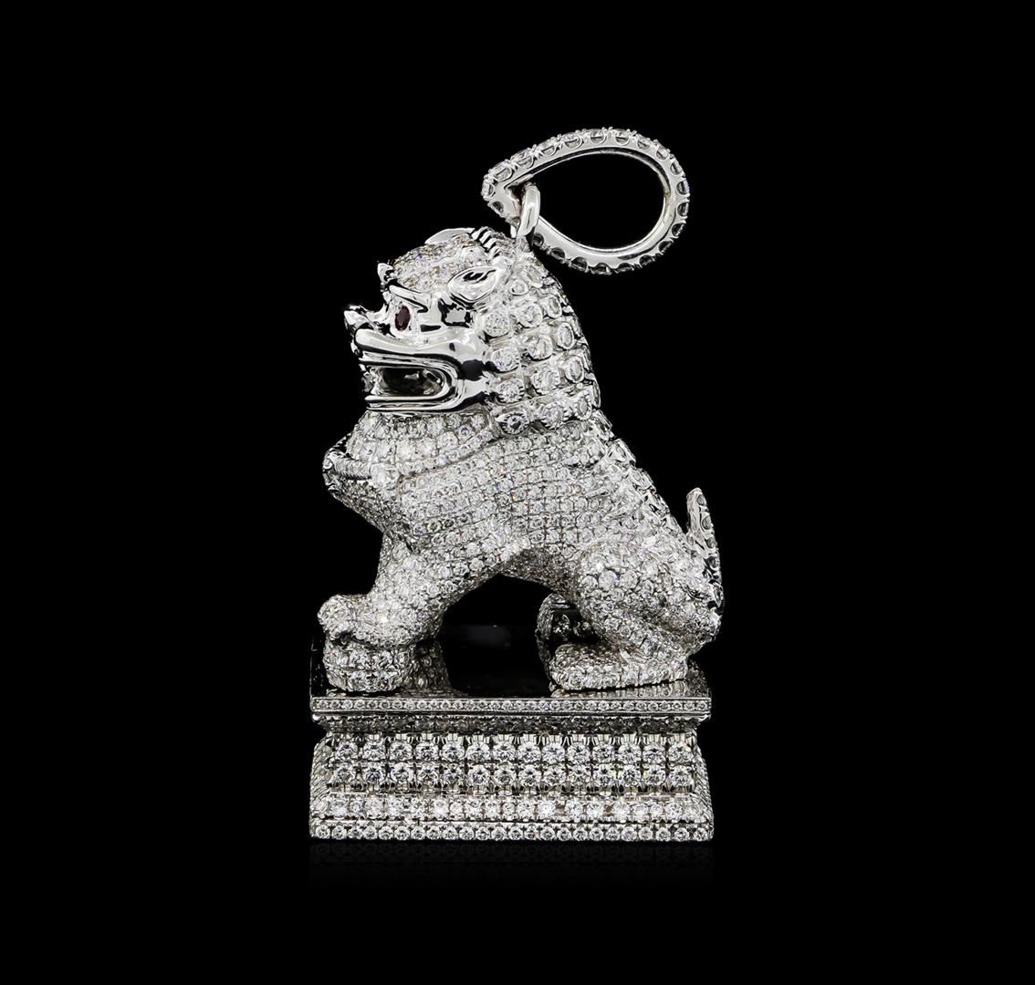 One electronically tested platinum cast & assembled diamond Chinese "Foo Dog" pendant with a bright and milgrain finish. The pendant features a Chinese "Foo Dog" motif. The body, legs, tail, and head of the foo dog are all diamond encrusted. Two rubies accent the eyes. The foo dog is placed on top of an elaborate pedestal with a lattice detailed bottom. The pendant is completed by a diamond set bail. Condition is new, good workmanship. Foo Dogs are actually lions. In China, where Foo Dogs originated thousands of years ago they are called shi meaning "lion" or shishi meaning "stone lion". Due to their resemblance to the Chow Chow and Shih Tzu they became called foo dogs in English. Foo dogs are also referred to as Chinese guardian lions, guardian dogs or stone temple dogs. Foo dogs are protective statues normally designed in pairs. One is female and the other is male. In this specific case the foo dog is male because the male dog is holding a diamond set ball underneath his paw. It is believed that the ball represents the world. Condition is new, good workmanship. Containing: One Hundred Forty-One prong set round brilliant cut diamonds, measuring 2.00 - 1.80 x 1.14mm (depth est.) approximate total weight of 141 Stones = 3.64ct. Graded in the setting. Clarity: VVS-1 to VS-1. Color: F - G Two Hundred Four prong & bezel set round brilliant cut diamonds, measuring 1.70 - 1.50 x 0.96mm (depth est.) approximate total weight of 204 Stones = 3.14ct. Graded in the setting. Clarity: VVS-1 to VS-1. Color: F - H Eight Hundred Fifty-Two prong set round brilliant cut diamonds, measuring 1.40 - 1.00 x 0.72mm (depth est.) approximate total weight of 852 Stones = 5.46ct. Graded in the setting. Clarity: VVS-1 to VS-1. Color: F - H. Total Weight of Diamonds 12.24ct. Total Weight of Pendant 69.64gm. AIG Appraised at $67,720.00.