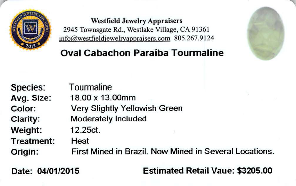 One oval cabochon cut natural Paraiba tourmaline exact weight 12.25ct., clarity is moderately included, cut is good. Westfield Appraised at $3,205.00.