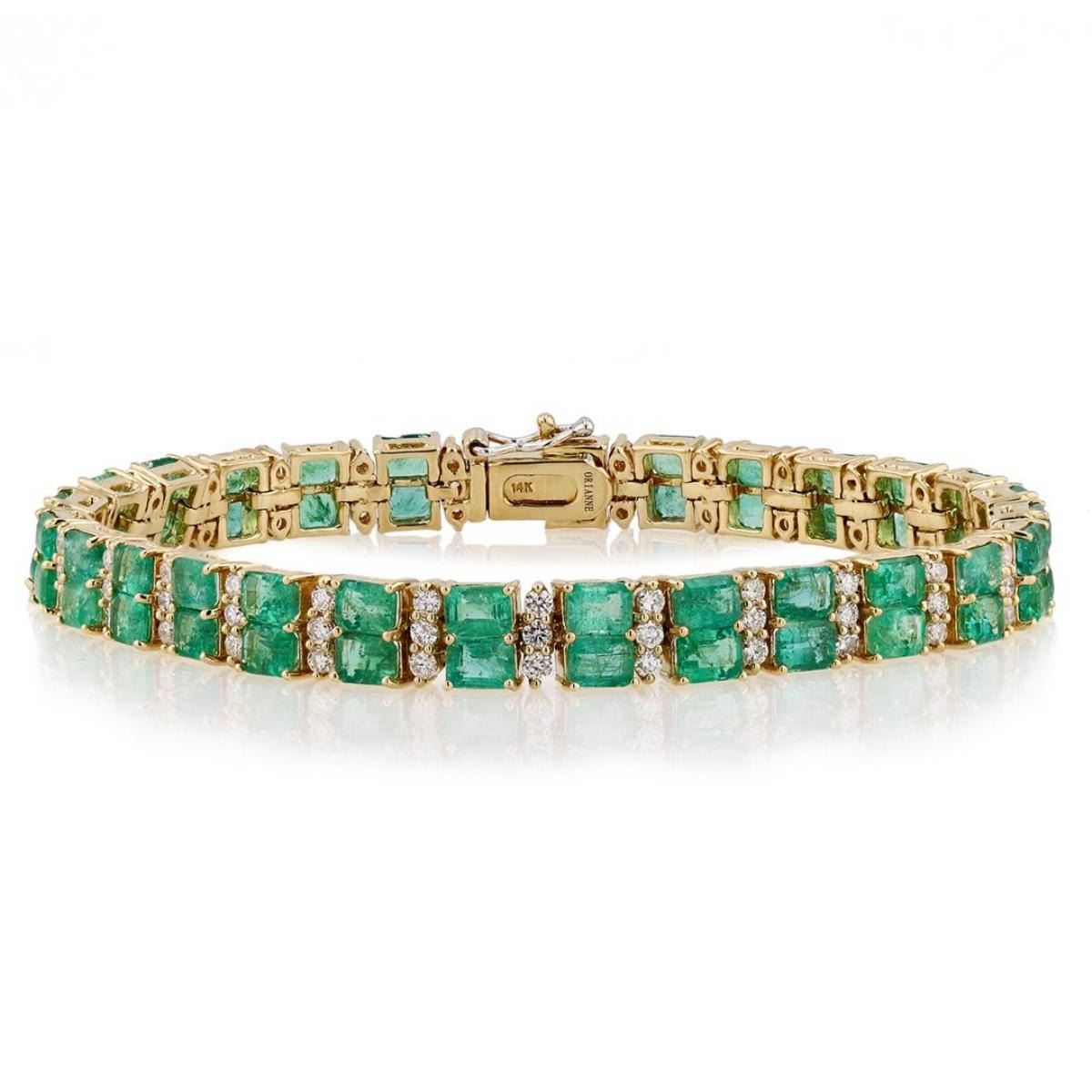 One lady's polished, stamped and electronically tested solid 14K Yellow Gold Designer Bracelet hallmarked "Orianne" mounted with: 54 Natural Emerald Cut Emerald (Beryl) gemstones hi-lighted by 81 Natural Earth Mined Diamonds. This item weighs 19.28 grams and measures 7.00 inches in length and 6.70 mm in width. This bracelet has been finished with a slip-in groove closure further secured by a single outside safety catch locking mechanism. The condition is BRAND NEW. The gemstones have been analyzed in the mounting. MAIN GEMSTONES IDENTITY: Natural Emerald (Beryl) SHAPE: Emerald (Faceted) MEASUREMENTS: 4.80x3.15 mm (no depth) QUANTITY: 54 CARAT WEIGHT: 12.25 ctw CLARITY TYPE: III=includes eye-visible features HUE: Rich Grass Green TRANSPARENCY: Transparent TONE: Medium SATURATION: Vivid-Bright QUALITY: 8 - Very Good-Excellent ADJACENT GEMSTONES IDENTITY: Natural Earth Mined Diamond CUT: Round Full (Faceted) QUANTITY: 81 CARAT WEIGHT: 2.20 ctw CLARITY GRADE: VS-2 to SI-1 COLOR GRADE: G CUT GRADE: 8 - Very Good-Excellent GEMSTONE CARAT WEIGHT: 12.25 ctw DIAMOND CARAT WEIGHT: 2.20 ctw ITEM GRAM WEIGHT: 19.28 gram