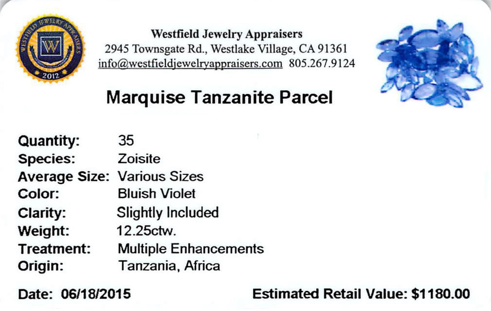 Thirty-five marquise mixed cut natural tanzanites exact total weight 12.25ct., clarity is slightly included, type I, medium dark, very slightly grayish, bluish violet color, (GIA bV 6/3), cut is good. Transmitting light with a minimum of distortion, transparent. Naturally occurring internal & external characteristics are present. Color grade is an average for the group. Tanzanite is a very rare gemstone that is only found in the country of Tanzania. Originally discovered in 1967. Tiffany & Company, named the stone Tanzanite. It is found in the Usumburu Mountains that border the Umba Valley of northern Tanzania. Tanzanite occurs in gray, brown, violet, blue, reddish-purple, & green. The gem is interesting because of its exceptional pleochroism. Rotated in different directions a tanzanite will exhibit multiple changes of color. Tanzanite has a low tolerance to ultrasonic cleaning, and should not be cleaned using this method. Westfield Appraised at $1,180.00.