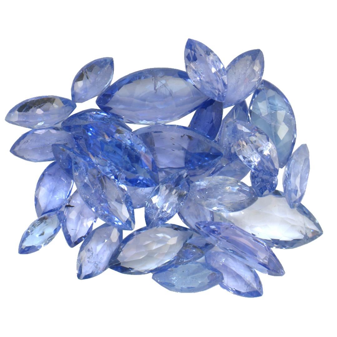 Thirty-five marquise mixed cut natural tanzanites exact total weight 12.25ct., clarity is slightly included, type I, medium dark, very slightly grayish, bluish violet color, (GIA bV 6/3), cut is good.    Transmitting light with a minimum of distortion, transparent. Naturally occurring internal & external characteristics are present. Color grade is an average for the group. Tanzanite is a very rare gemstone that is only found in the country of Tanzania. Originally discovered in 1967. Tiffany & Company, named the stone Tanzanite. It is found in the Usumburu Mountains that border the Umba Valley of northern Tanzania. Tanzanite occurs in gray, brown, violet, blue, reddish-purple, & green. The gem is interesting because of its exceptional pleochroism. Rotated in different directions a tanzanite will exhibit multiple changes of color. Tanzanite has a low tolerance to ultrasonic cleaning, and should not be cleaned using this method. Westfield Appraised.
